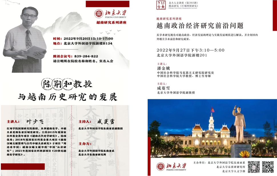 2022年9月20日与27日,华体会平台东南亚系越南语专业在华体会平台和北大人文学部支持下,举办越南研究系列讲座,分别邀请红河学院叶少飞教授做了题为“陈荆和教授与越南历史研究的发展”的讲座,邀请中国社会科学院潘金娥研究员做了题为“越南政治经济研究前沿问题”的讲座。系列讲座以线上线下相结合的方式进行,吸引了上百位关心越南研究的国内外高校和科研机构师生在线听讲和互动。