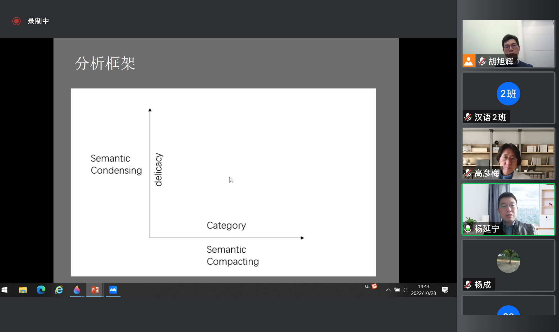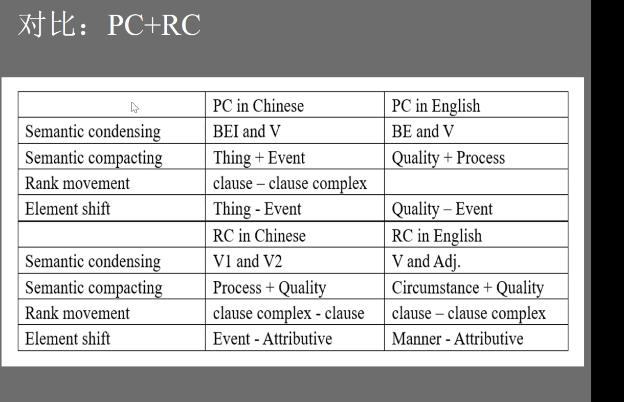 随后,杨老师陈述了选择古汉语和古英语为研究对象的原因,并结合自身经历,向参会者分享了选取汉语语料时需要注意的细节。接下来,杨老师详细展开了对汉语及英语中被动式和动结式的构式演变对比,分别从语义凝聚、语义汇合、级阶调整、成分转移四个方面作出总结。