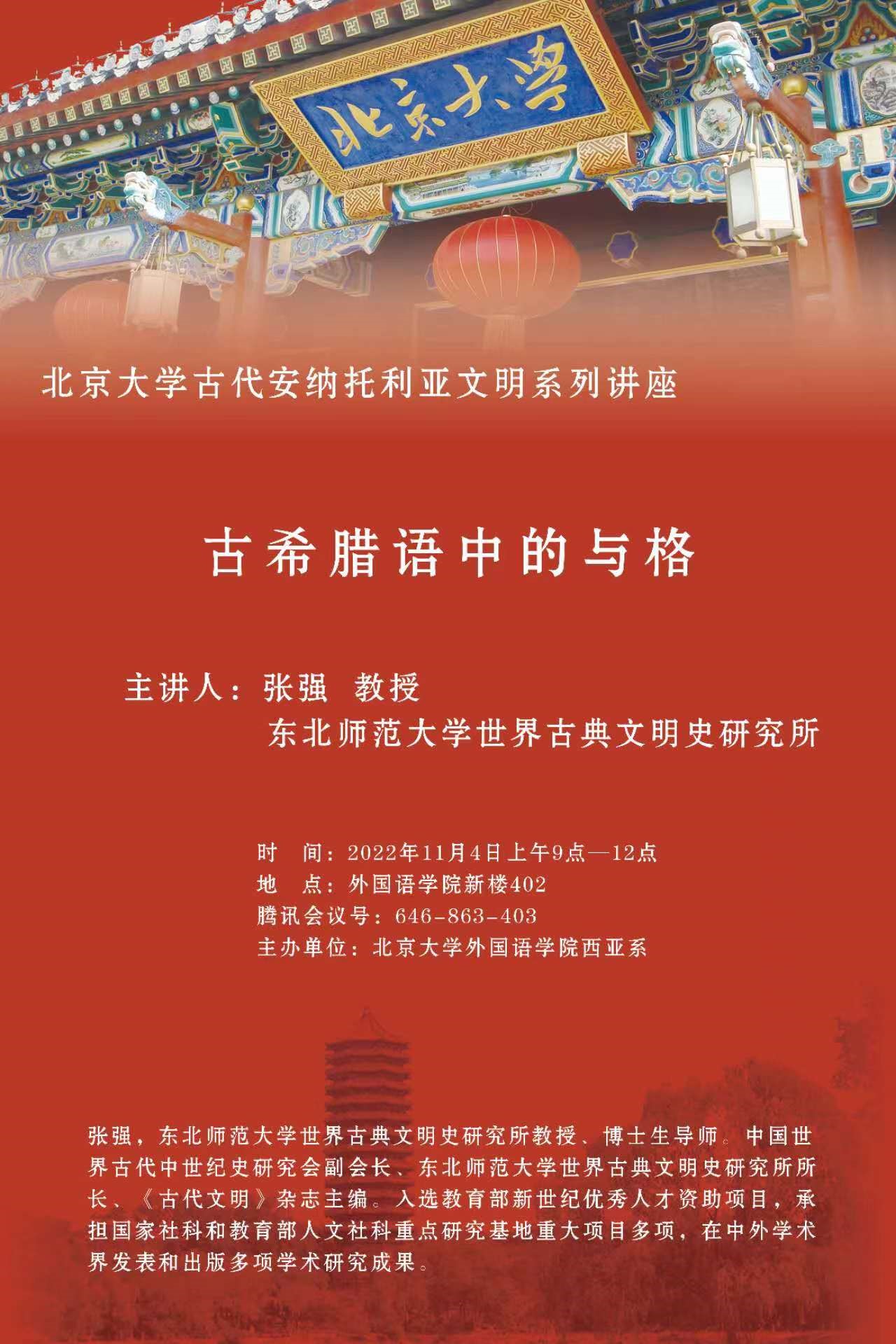 2022年11月4日上午,东北师范大学世界古典文明史研究所所长张强教授应华体会平台西亚系之邀进行了题为“古希腊语中的与格”的讲座。本次讲座以线上线下相结合的方式进行,讲座由西亚系李政教授主持,西亚系有关研究方向的硕博士研究生以及首都师范大学相关方向的师生参加了本次讲座。