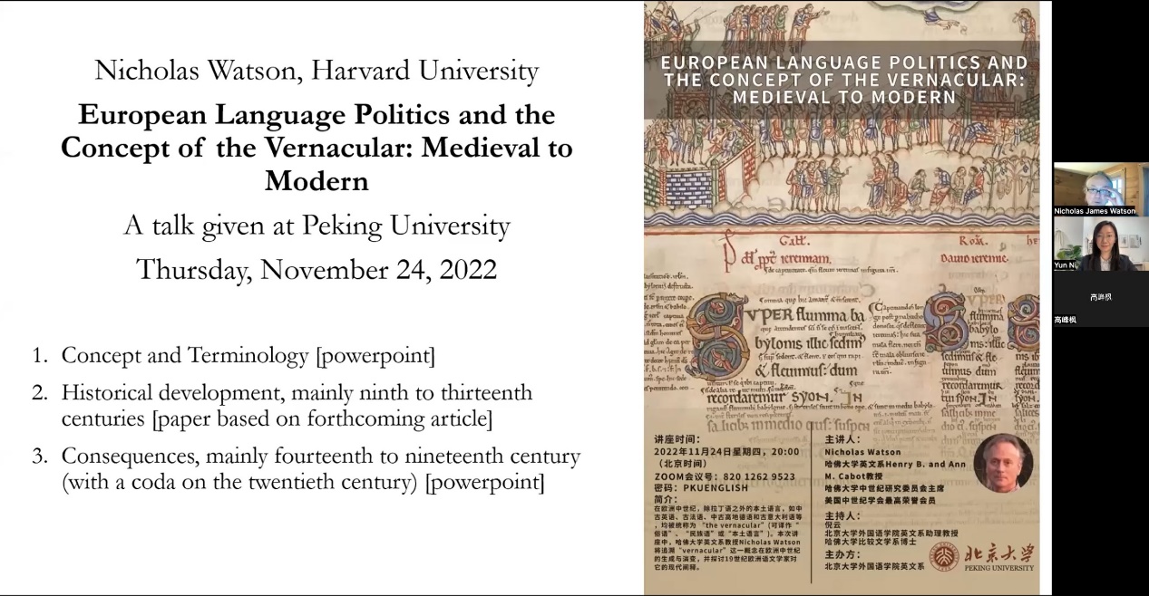 2022年11月24日,哈佛大学英文系教授尼古拉斯·沃特森(Nicholas Watson)应华体会平台英语系邀请,为北大师生在线上进行了题为“欧洲中世纪到现代的语言政治与俗语的概念”(European Language Politics and the Concept of the Vernacular: Medieval to Modern)的专题讲座。本讲座由华体会平台英语系主办,华体会平台英语系助理教授倪云主持、评议。