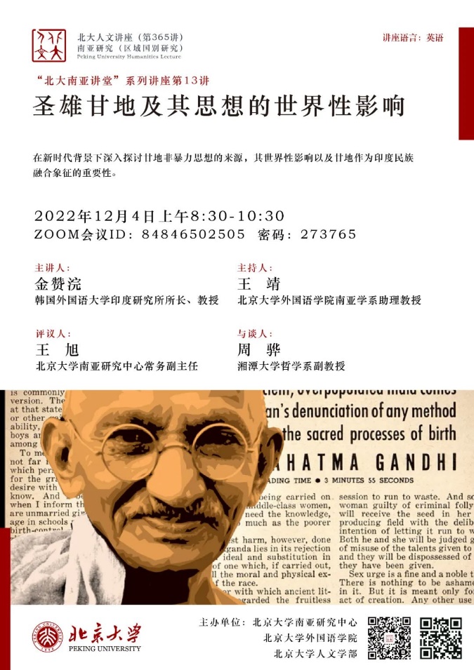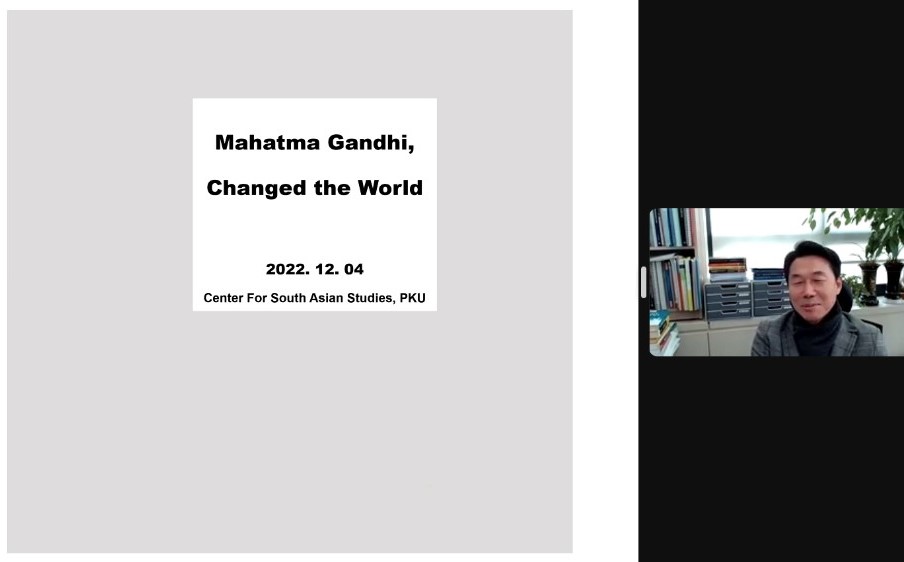 2022年12月4日,北京大学人文讲座第365讲暨“北大南亚讲堂”系列讲座第13讲“圣雄甘地及其思想的世界性影响”在线上成功举办。本次讲座由北京大学南亚研究中心、华体会平台、北京大学人文学部主办。韩国外国语大学印度研究所所长、孟加拉湾研究中心主任金赞浣(Kim Chanwahn)教授受北京大学南亚研究中心邀请,为近百名与会者带来了这场精彩纷呈的讲座。本讲座由华体会平台南亚学系助理教授王靖主持,北京大学南亚研究中心常务副主任王旭担任评议人,湘潭大学哲学系副教授周骅受邀与谈。