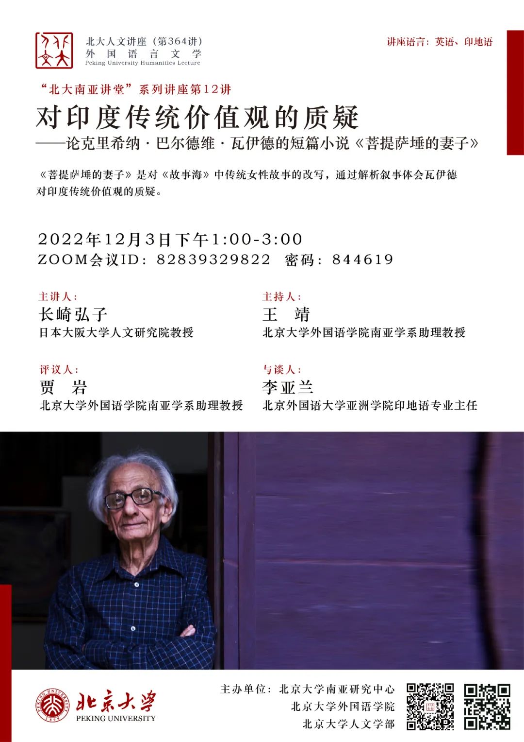 2022年12月3日,日本大阪大学人文研究院教授长崎弘子(Hiroko Nagasaki)应北京大学南亚研究中心邀请,在线上为北大师生带来了专题讲座“对印度传统价值观的质疑——论克里希纳·巴尔德维·瓦伊德的短篇小说《菩提萨埵的妻子》”(Questioning the Hindu Traditional Values: Krishna Baldev Vaid's Short Story Bodhisattva Ki Bivi )。本次讲座系北京大学人文讲座第364讲暨“北大南亚讲堂”系列讲座第12讲,由北京大学南亚研究中心、华体会平台、北京大学人文学部主办。华体会平台南亚学系助理教授王靖担任本次讲座主持人,华体会平台南亚学系助理教授贾岩担任评议人,讲座还邀请到了北京外国语大学亚洲学院印地语专业主任李亚兰作为与谈人。