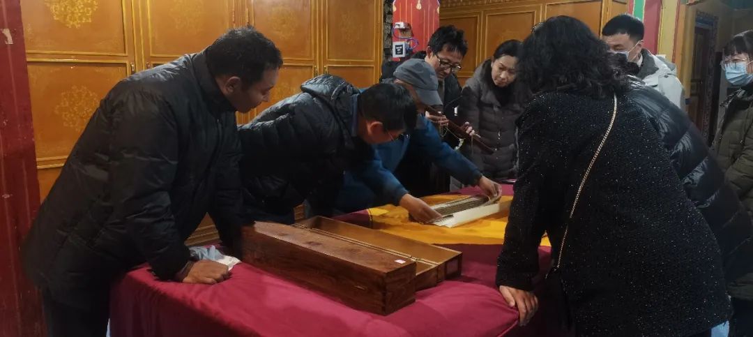调研团克服高原反应带来的不适,在布达拉宫管理处觉单处长及相关工作人员的陪同下,实地调研了布达拉宫和罗布林卡收藏的梵文贝叶经,了解了梵文贝叶经目录整理情况,查阅了部分梵文贝叶经,就贝叶经的字体、断代、价值评估、内容研究等方面的议题与相关学者进行了深入交流。在布达拉宫贝叶经修复研究室,考察组调研了布达拉宫对残损贝叶经的修护保护流程及其初步成果,并就贝叶经残损文字修复保存情况进行了深入交流。