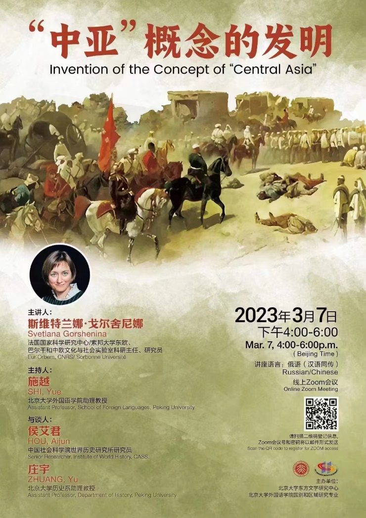 2023年3月7日,法国国家科学研究中心/索邦大学东欧、巴尔干和中欧文化和社会实验室(Cultures et sociétés d'Europe orientale, balkanique et médiane, EUR’ORBEM)科研主任、研究员斯维特兰娜·戈尔舍尼娜(Светлана М. Горшенина)应邀做了题为“‘中亚’概念的发明”的线上讲座。本期讲座由北京大学东方文学研究中心、华体会平台国别和区域研究专业主办,华体会平台助理教授施越主持,中国社科院世界历史研究所研究员侯艾君和北京大学历史学系助理教授庄宇担任与谈人。
