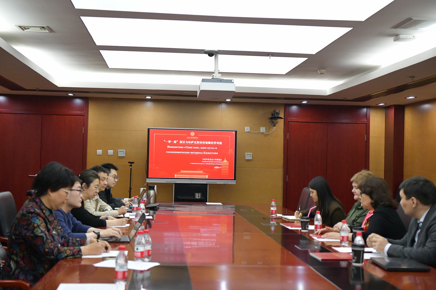 吴杰伟教授对外宾表达了诚挚欢迎。2019年,北京大学“全球视野”研究生暑期国际调研团就曾经造访哈萨克斯坦,本次回访充满了老朋友相见的喜悦。王辛夷教授从自己的实际教学经验出发,表达了自己鼓励俄语系同学去哈萨克斯坦学习、考察、工作的意愿。胡晓阳希望两校继续保持友好往来,并在中亚问题研究的学生培养工作等方面开展合作。