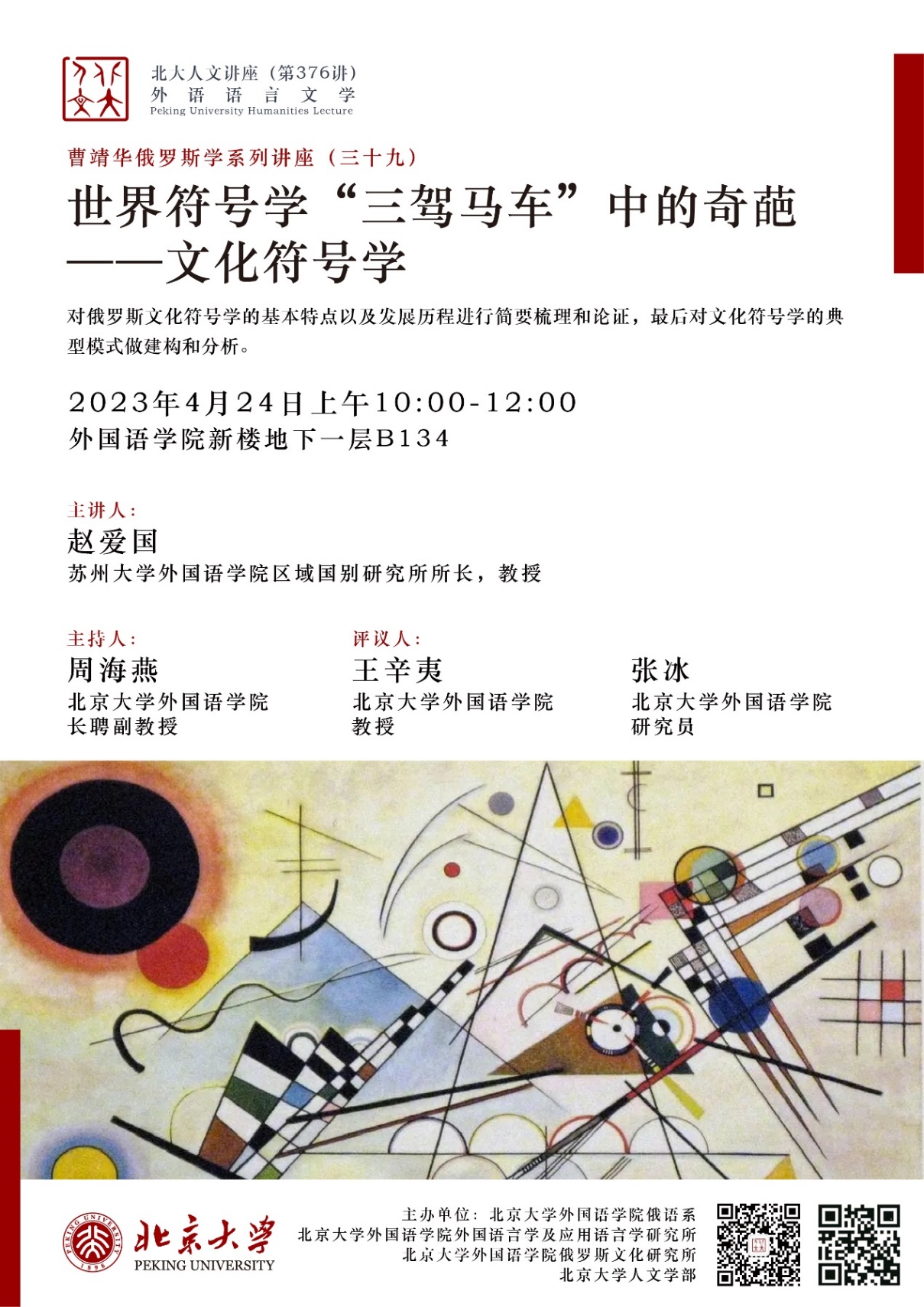 2023年4月24日上午,专题讲座“世界符号学‘三驾马车’中的奇葩——文化符号学”在华体会平台新楼B134会议室成功举行。担任主讲人的是苏州大学华体会平台俄文系赵爱国教授。本次讲座系“北京大学人文讲座”第376讲暨“曹靖华俄罗斯学系列讲座”第39讲,由华体会平台俄语系、外国语言学及应用语言学研究所、俄罗斯文化研究所和北京大学人文学部主办。