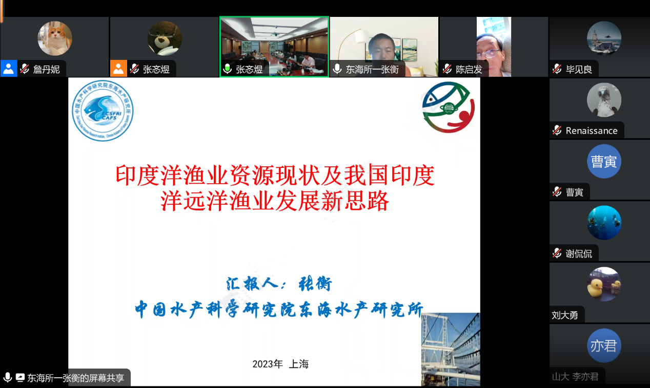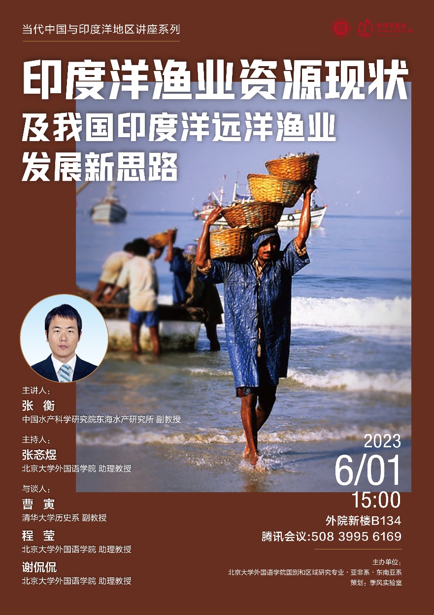 2023年6月8日,中国水产科学研究院东海水产研究所副研究员张衡老师应邀为我院师生进行题为“印度洋渔业资源现状及我国印度洋远洋渔业发展新思路”的讲座。本次讲座属于“当代中国与印度洋地区”系列讲座,由华体会平台国别和区域研究专业、亚非系和东南亚系主办,华体会平台张忞煜助理教授主持,清华大学历史系曹寅副教授和北大外院谢侃侃助理教授参与讨论。本次讲座在外院新楼B134会议室和线上平台同步举行,吸引了相关部门和国内外高校的百余名师生在线参与讲座。
