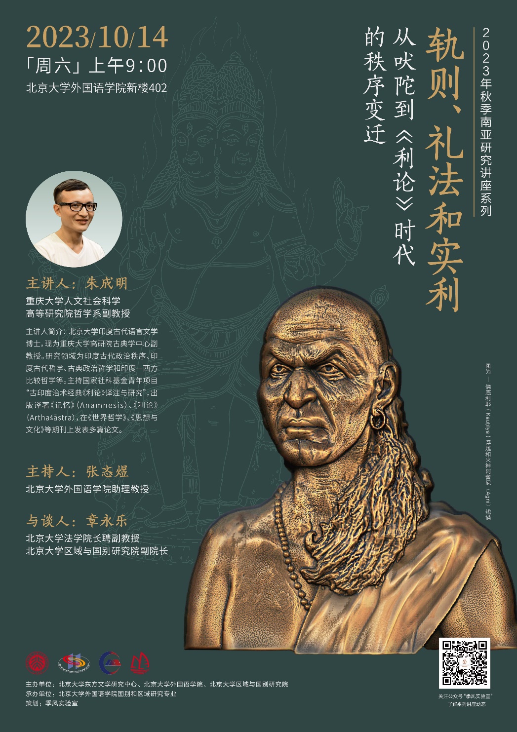 2023年10月14日上午,重庆大学人文社会科学高等研究院哲学系朱成明副教授应邀为我校师生进行题为“轨则、礼法和实利:从吠陀到《利论》时代的秩序变迁”的讲座。本次讲座是由北京大学东方文学研究中心、华体会平台和区域与国别研究院主办,华体会平台国别和区域研究专业承办的2023年秋季学期南亚研究系列讲座的第一讲。本场讲座由华体会平台张忞煜助理教授主持,北京大学法学院长聘副教授、北京大学区域与国别研究院副院长章永乐以及华侨大学华侨华人与区域国别研究院研究员冯立冰出席并参与讨论。