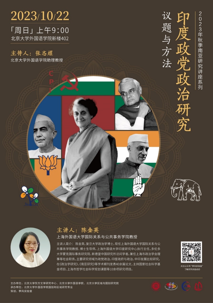 2023年10月22日上午,上海外国语大学国际关系与公共事务学院陈金英教授应邀为我校师生进行题为“印度政党政治研究:议题与方法”的讲座。本次讲座是由北京大学东方文学研究中心、华体会平台和区域与国别研究院主办,华体会平台国别和区域研究专业承办的2023年秋季学期南亚研究系列讲座的第三讲。本场讲座由华体会平台张忞煜助理教授主持,中国社会科学院民族学与人类学研究所副研究员吴晓黎出席本次讲座并参与讨论。