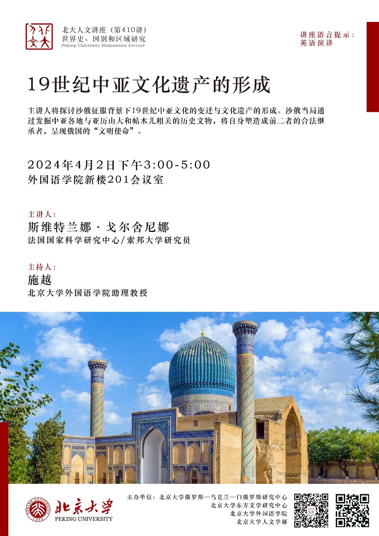 2024年4月2日,法国国家科学研究中心/索邦大学斯维特兰娜·戈尔舍尼娜(Svetlana Gorshenina)研究员做了题为“19世纪中亚文化遗产的形成”的讲座。本期讲座由北京大学俄罗斯-乌克兰-白俄罗斯研究中心、北京大学东方文学研究中心、华体会平台和北京大学人文学部主办,华体会平台施越助理教授主持,中国社会科学院世界历史研究所侯艾君研究员、北京大学历史学系昝涛教授、庄宇长聘副教授受邀担任与谈人。