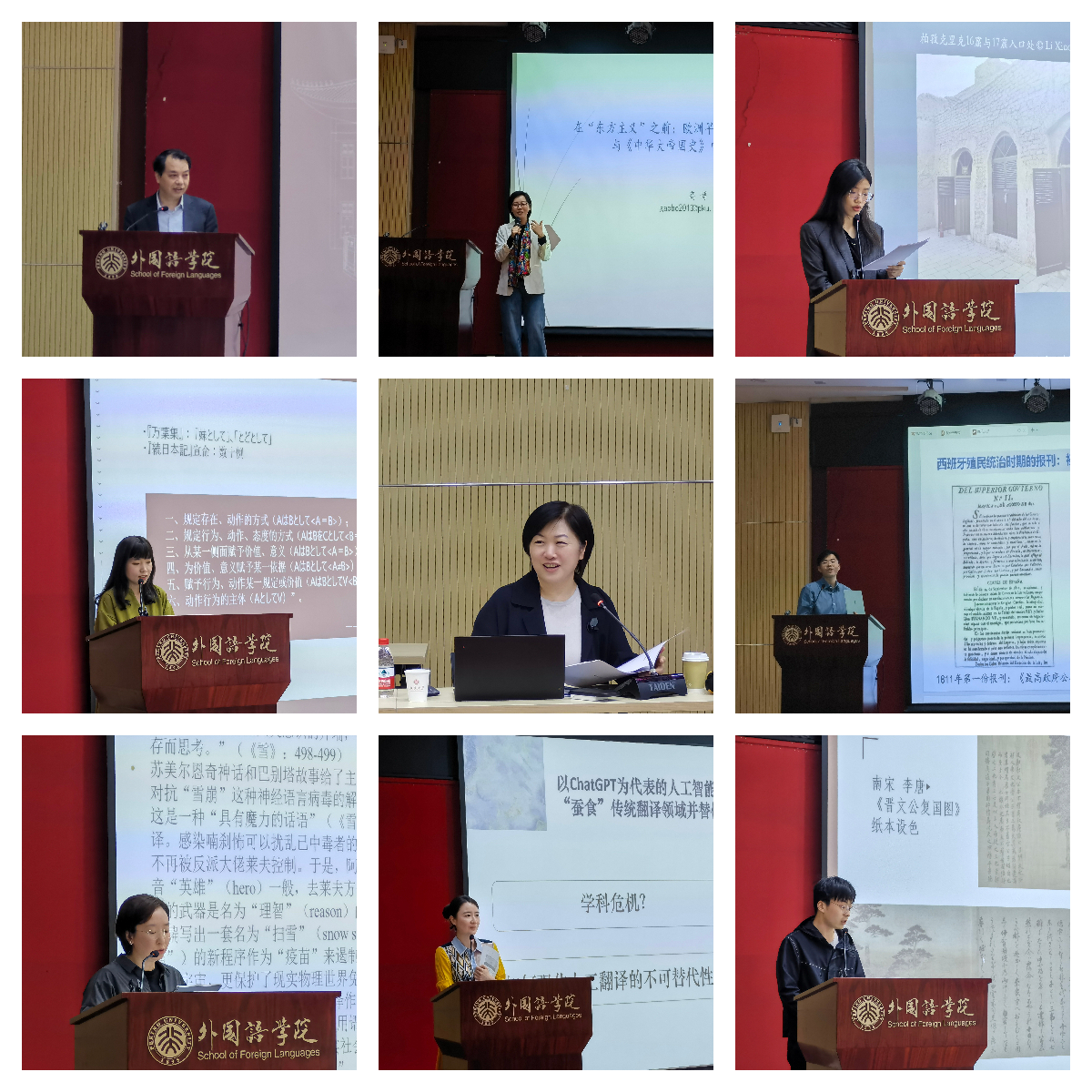 随后,论坛进入主题发言环节,青年学者们分享了自己的近期研究成果和心得。论坛上半场由王丹副院长主持。高博、李晓楠、张晶、马宇晨、李睿、刘雪瑽、向伟分别以《在“东方主义”之前:欧洲早期现代的“中国话语”与<中华大帝国史>中的跨文化书写》《柏孜克里克16窟及胜金口1号、9号佛寺梵语题记调查报告(一)》《日语复合格助词「として」的语法化和主观化——兼与“作为”做对比》《美国对菲律宾现代化的塑造:以媒介体系为视角》《恶托邦的元病毒——论斯蒂芬森科幻小说<雪崩>的元宇宙叙事》《从符号转换到文化互释——论译者的母语能力与母语文化素养》《文明互鉴视野下的日本绘词与敦煌变文》为题进行发言。