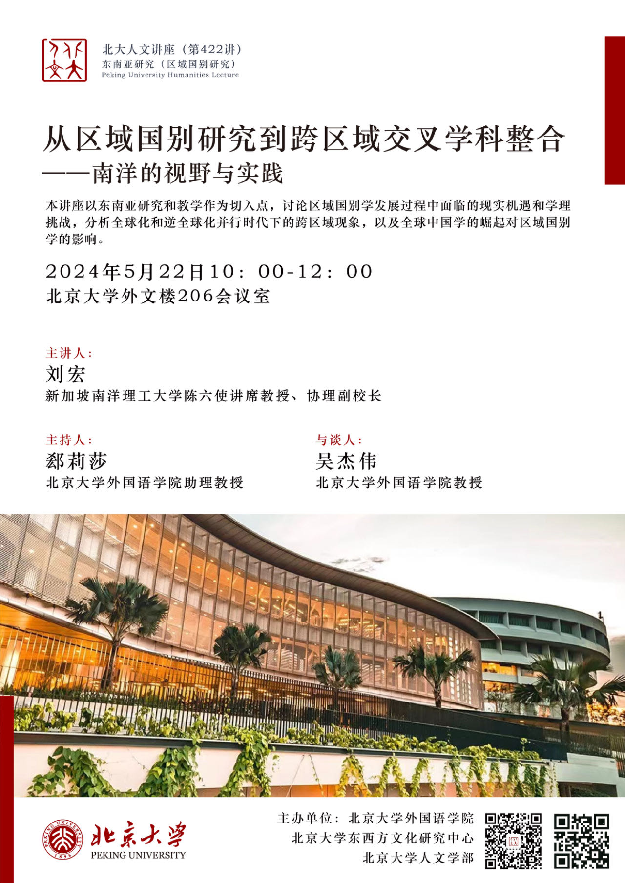 2024年5月22日,新加坡南洋理工大学协理副校长、陈六使讲席教授刘宏做了题为“从区域国别研究到跨区域交叉学科整合——南洋的视野与实践”的讲座。本期讲座是北京大学人文系列讲座的第422讲,由华体会平台、北京大学东西方文化研究中心和北京大学人文学部主办,华体会平台郄莉莎助理教授主持,华体会平台教授吴杰伟受邀担任与谈人。