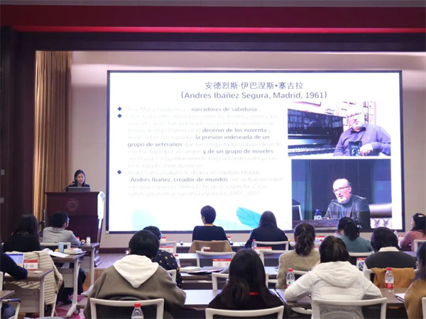 分论坛一的主题是“西葡语文学与作家作品研究(一):谱系·时代·伦理”,分论坛由南京大学张伟劼主持,与会学者的论文涉猎十九世纪至当代十余位西葡语作家的写作实践与文艺思考。首都师范大学杨玲以安德烈斯·伊巴涅斯《一种更高的生活》为例,从文体、主题、修辞等方面剖析这位西班牙当代作家的艺术风格,评析这部作品如何“把小说写成音乐”,探索并到达真正的彼岸。中国人民大学李卓群提炼并阐释了西班牙战后作家马丁-桑托斯以“辩证现实主义”与“低层现实主义”为核心的文艺创作观,在文本细读中展示作家对其文艺观的创作实践。北京大学蔡学娣分析西班牙当代作家安德烈斯·巴尔瓦《光明共和国》中的儿童形象,探讨作者对于传统的“童真”概念的质疑和重新定义,以及对于秩序、暴力以及文明本身等理念的反思和重构。南开大学梁嘉艺关注西班牙当代作家阿尔瓦罗·庞波,指出其小说通过对存在主义的思考,揭示了伦理与道德的重要性:只有在一定的伦理关系中遵循道德的牵引,才能在纷杂的世界中完成自我价值的实现。东南大学田原聚焦当代哥伦比亚作家劳拉·雷斯特雷波文学创作中的情感书写与社会批判,阐释她作品中丰富的情感主题及其叙述方式,挖掘作品如何反映社会问题,揭露社会不公和人性弱点。汕头大学史志龙关注阿根廷作家安娜·玛丽亚·舒亚的微小说创作,探讨她如何在有限的篇幅内实现叙事的深度和广度,揭示其作品中的拉美文化、社会意义和政治现状。北京大学许彤的研究基于西班牙十九世纪文人贝克尔的诗歌创作和诗歌批评,通过文本细读,探讨“‘干’‘炼’之诗”风格创新中蕴含的抒情内在化和抽象化诉求,分析贝克尔抒情诗的现代性表征。北京理工大学曾艳分析艾米莉亚·帕尔多·巴桑叙事文本中作为表征的时尚案例,解读十九、二十世纪之交西班牙“新女性”形象及其背后的历史传统和当代社会思潮。浙江越秀华体会平台张啸研究豪尔赫·纪廉诗歌中“物本体书写”话语谱系,通过对物本体的多样谱写,诗人反思批判了人类中心主义,构建物的诗性自治,实现了“走出人类世”的“物物共生”诗歌生态化的可能。中国传媒大学黄婷以巴西诗人哈罗德·德·坎波斯翻译理论中的“创译”批评思想为根据,探究巴西具体派诗人对中国古典诗歌的美学解读和“再想象”、“再创造”过程中所提出的翻译问题。马德里自治大学盛妍分析何塞·安赫尔·巴伦特的三首艺格敷词诗歌,以及路易斯·费尔南德斯和保罗·克利的三幅画作,通过比较研究强调自然作为艺术灵感之源与哲学探究之源的持久相关性。评议人卢云、谷佳维、张伟劼、杨玲、许彤与十一位参与论文发表的老师展开了交流。