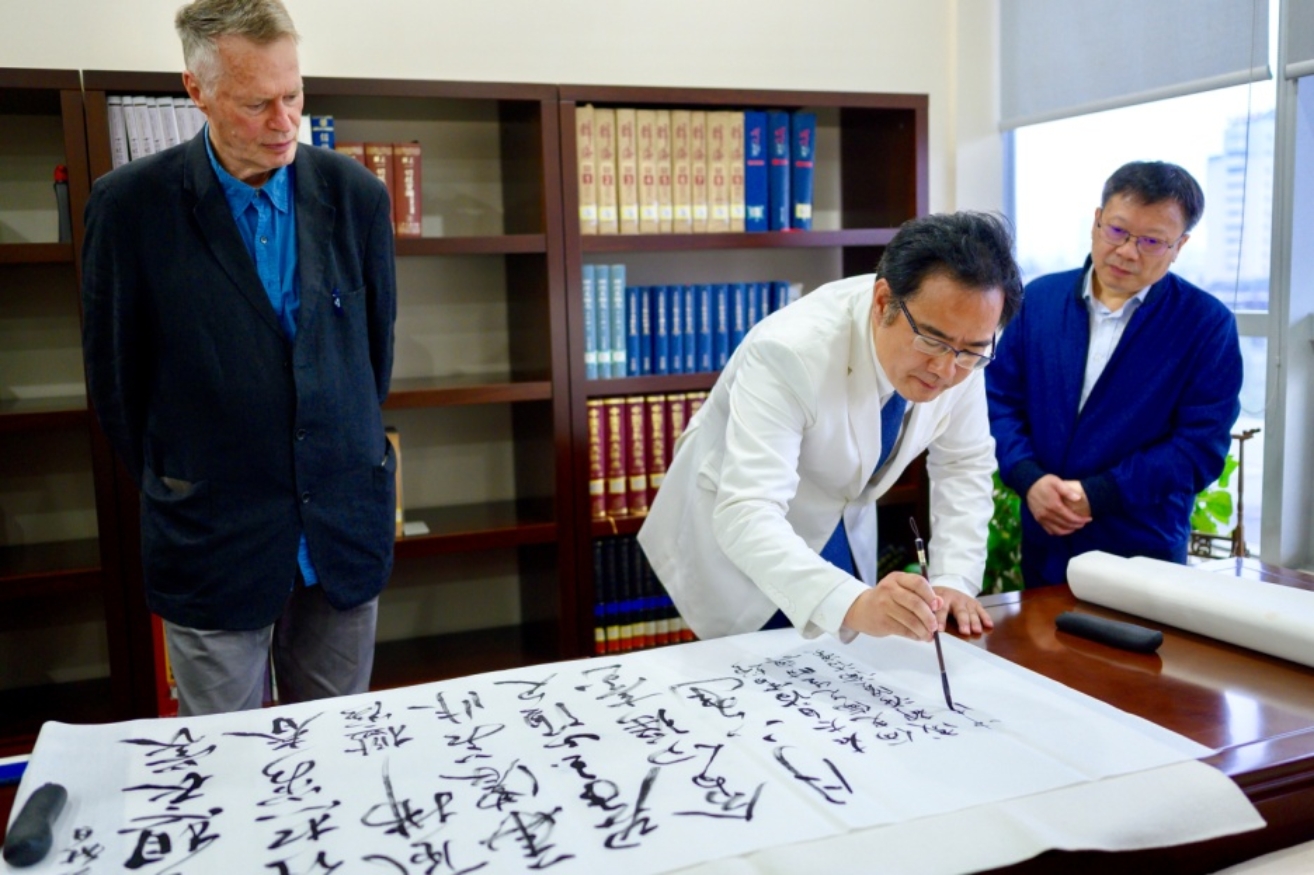 勒克莱齐奥观看董强现场挥毫书写李白的诗句(四川省图书馆)