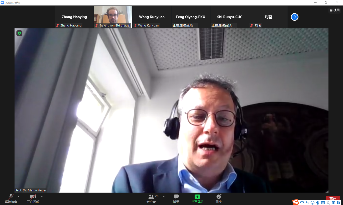8月14日,暑期学校举行线上开学典礼暨见面会。德方学术指导、柏林洪堡大学法学院常务副院长马丁•黑格教授(Prof. Dr. Martin Heger)和中方负责人、北京大学德语系毛明超助理教授先后致辞。他们对参加暑期学校的同学们表示了热烈的欢迎。洪堡大学国际处的封•施图尔普纳格尔博士(Dr. Sievert von Stülpnagel)对暑期学校的课程安排和教师团队做了简要介绍。