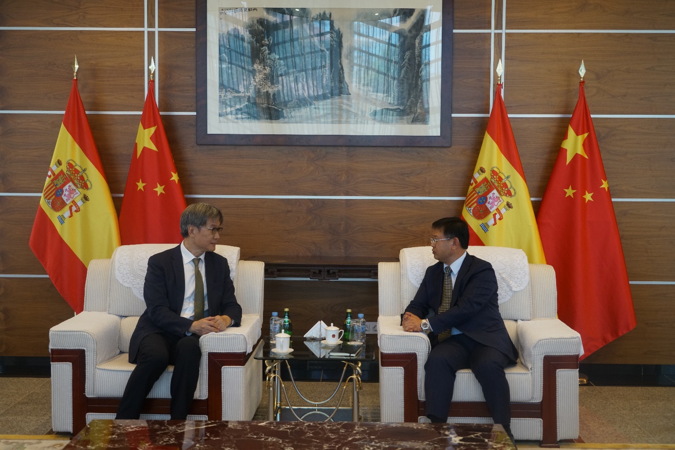 随后代表团拜访了中国驻西班牙大使馆。公使屈浔介绍了西班牙独特的历史和亲华友华的社会氛围,回顾国家主席习近平2018年的国事访问、今年3月9日从义乌和马德里双向对开的“中西建交纪念号”中欧班列,强调西班牙首相即将访华,中西文化和旅游年也将于月底开幕,陆续举办民乐团音乐会、“中国秦汉文明的遗产”展、“中国历代绘画大系”之宋画展和“中国茶文化”展等精彩活动。王博向屈浔公使介绍了北京大学与西班牙高校的交流合作情况。他表示,今年是北京大学的“国际战略年”,学校将在使馆的支持下不断加强和西班牙高校的合作,并配合做好两国建交50周年庆祝工作,依托自身优势举办特色教育交流活动。