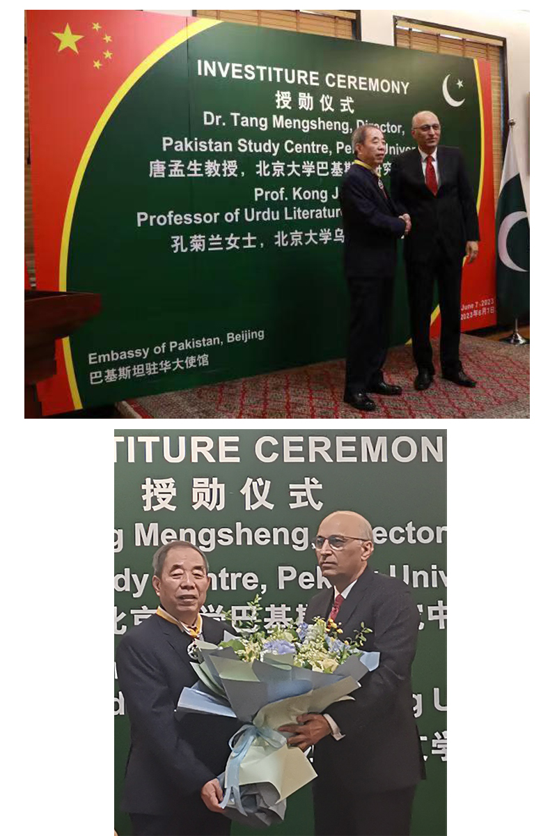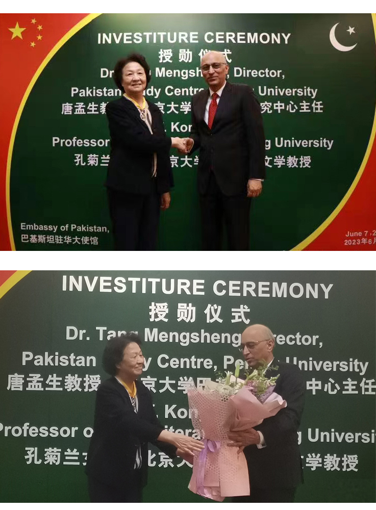 2023年6月7日,巴基斯坦驻华大使馆举办隆重仪式,授予华体会平台南亚学系唐孟生教授与孔菊兰教授巴基斯坦“卓越之星”勋章,以表彰两位学者在推动乌尔都语教学、增进两国人文交流、增进中巴友谊方面作出的重要贡献。巴基斯坦驻华大使莫因·哈克、政务参赞穆罕默德·卢曼·艾哈迈德、武官Ranna Faisal Rafiq准将、社会福利公使Ijaz Ahmad、科技公使Kamran Rasheed博士,以及原中国驻(巴基斯坦)卡拉奇总领事安启光、三峡集团财务总监王少峰等各界人士出席了授勋仪式。