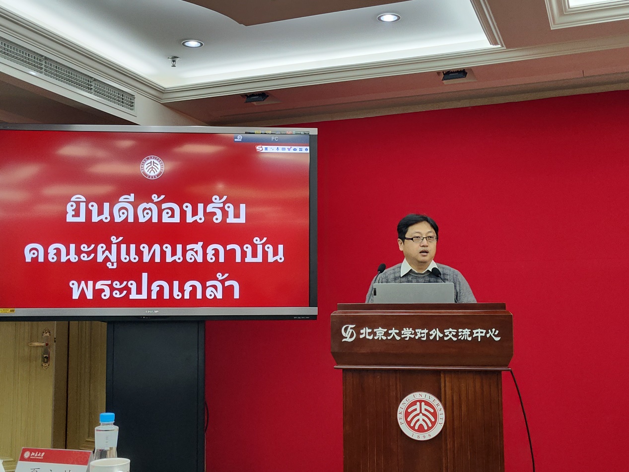 交流会在英杰交流中心第二会议室举行,华体会平台东南亚系泰语专业的金勇、万悦容和熊燃几位老师,以及来自泰语专业的本科和研究生同学共24人参加了会议。交流会由博士生陈洪锋主持,华体会平台东南亚系副主任、泰语专业主任金勇老师致欢迎辞,并向各位来宾介绍了北京大学泰语专业的发展概况和北京大学诗琳通科技文化交流中心与诗琳通泰学讲席的相关情况。硕士生王与肖介绍了北京大学的历史与现状。代表团团长波汶萨·乌万诺主席发表讲话,回顾了他所经历的中泰关系发展的重要时刻,表达了对两国未来,特别是两国青年人携手共进的良好祝愿。