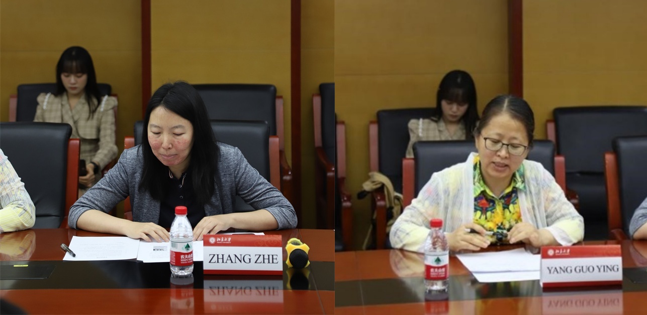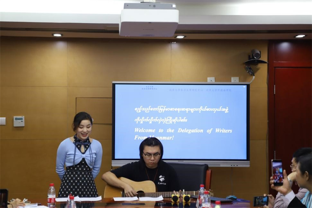 致辞结束,缅甸作家代表团与缅甸语专业师生用缅语交流。本科四年级学生尚晋豪介绍了北京大学的光荣传统与历史;缅语教研室主任张哲老师代表专业介绍了北大缅语专业的历史沿革、1949年至今的人才培养、教材建设、课程建设和科研成果,向代表们展示由缅语教研室教师出版的《缅甸诗选》、《缅甸方言研究》等语言、文学类专著、译著。杨国影副教授详细介绍近五年来缅甸语教研室已翻译出版和正在计划出版的缅甸文学作品,包括《如愿》、《雨夜雾梦》、《等待花开之时》、《六边形》、《缅甸短篇小说选》、《缅甸儿童文学作品选》等。