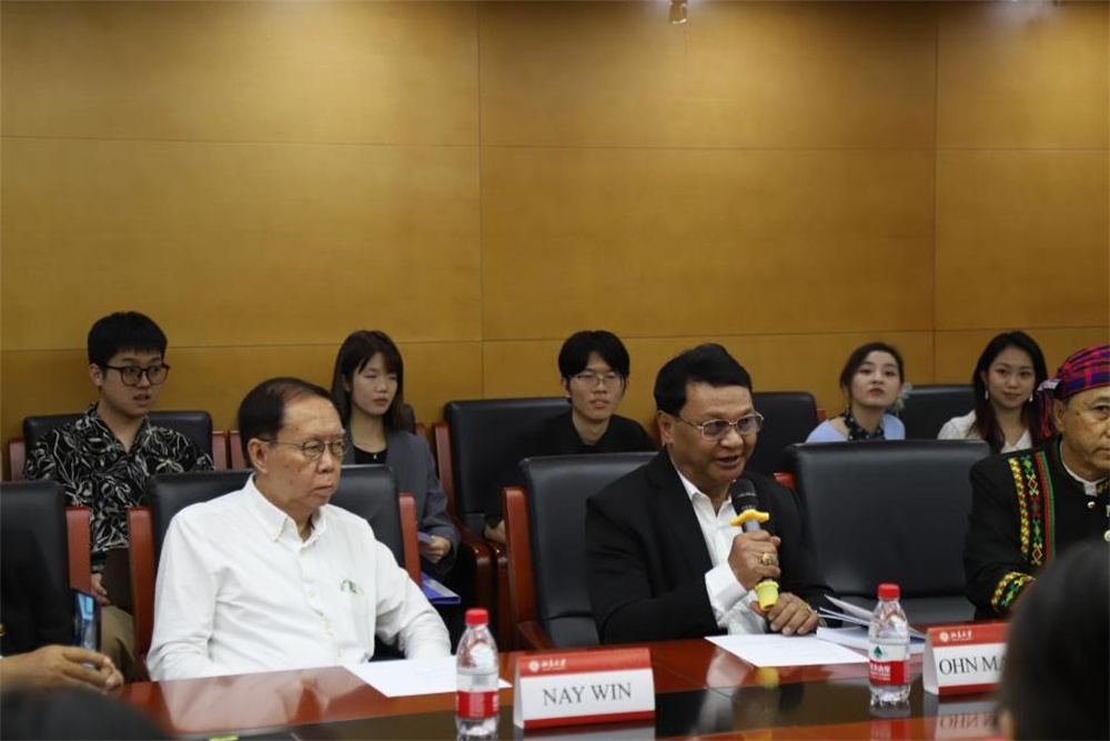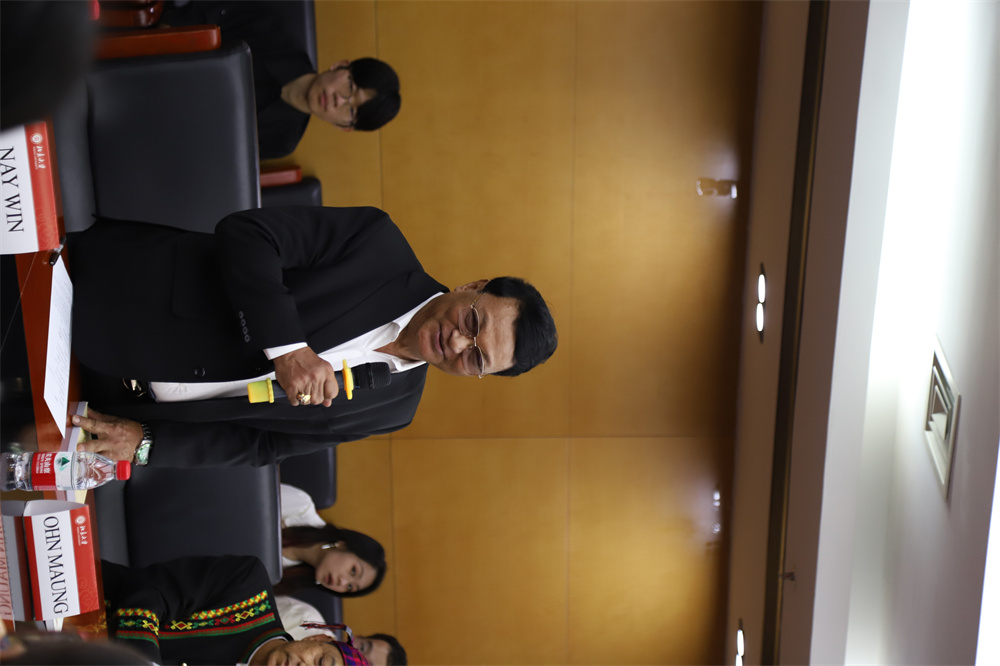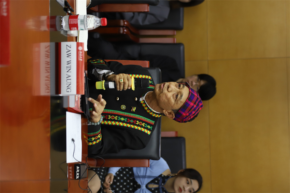 缅甸作家协会主席、缅甸国家文学终身成就奖获得者、功勋文学家吴翁貌先生致辞。他表示,非常荣幸到访历史悠久、蜚声中外的中国最高学府北京大学。缅语专业师生们的热情和歌声,让缅甸代表们倍感温暖与亲切,希望此次交流激发青年人对缅甸文学的兴趣,鼓舞文坛作品互译交流,以实现文明互鉴。