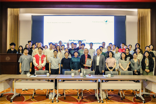 报告结束后,听众踊跃提问并展开热烈讨论。与会师生和希勒老师就德国自然书写的传统和当下潮流、当代德语文学作品中事实与虚构的关系及作者对其的处理方式、当代德语文学作品的语言特征和跨媒介特质以及德国人生活中与自然的关系等话题,进行了深入探讨。本次讲座吸引了柏林自由大学、柏林洪堡大学、社科院、清华大学等兄弟高校与合作机构的多位学者到访。最后,全体与会人员上台合影留念,讲座圆满结束。