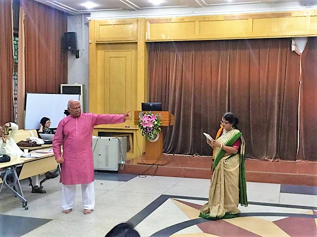 毕业于北京大学印地语专业的校友,中国的印度舞蹈专家金珊珊女士介绍了她编导泰戈尔《齐德拉》音乐舞蹈史诗剧的经验,并和她的学生们展现了古典印度舞蹈之美。印度国际大学华体会平台院长阿维杰特•森教授(Prof. Abhijit Sen)在他有关泰戈尔戏剧发展史的学术报告中,邀请国际大学艺术家高什夫妇( Avik Ghosh/Ms. Gargi Ghosh)呈现了六部泰戈尔经典戏剧的精彩片段。孟加拉国77岁的资深艺术家阿达乌尔•拉赫曼(Mr. Ataur Rahman)为大会做了“孟加拉国泰戈尔戏剧演出史”的精彩大会发言,并与印度艺术家咖尔吉•高什(Ms. Gargi Ghosh)表演了泰戈尔《红夹竹桃》的精彩片段。《红夹竹桃》是泰戈尔最有代表性的戏剧作品之一,本次演出是该剧在中国的首演,演出剧本改编自北京大学资深教授刘安武先生的译本,北京大学 “泰戈尔导读”课程团队参与组织,北京大学六位学子和玺莹仁剧团联合六位国际友人,插入多语种朗诵片段。与会者认为演出独具特色,创新性地表现了《红夹竹桃》的意义。