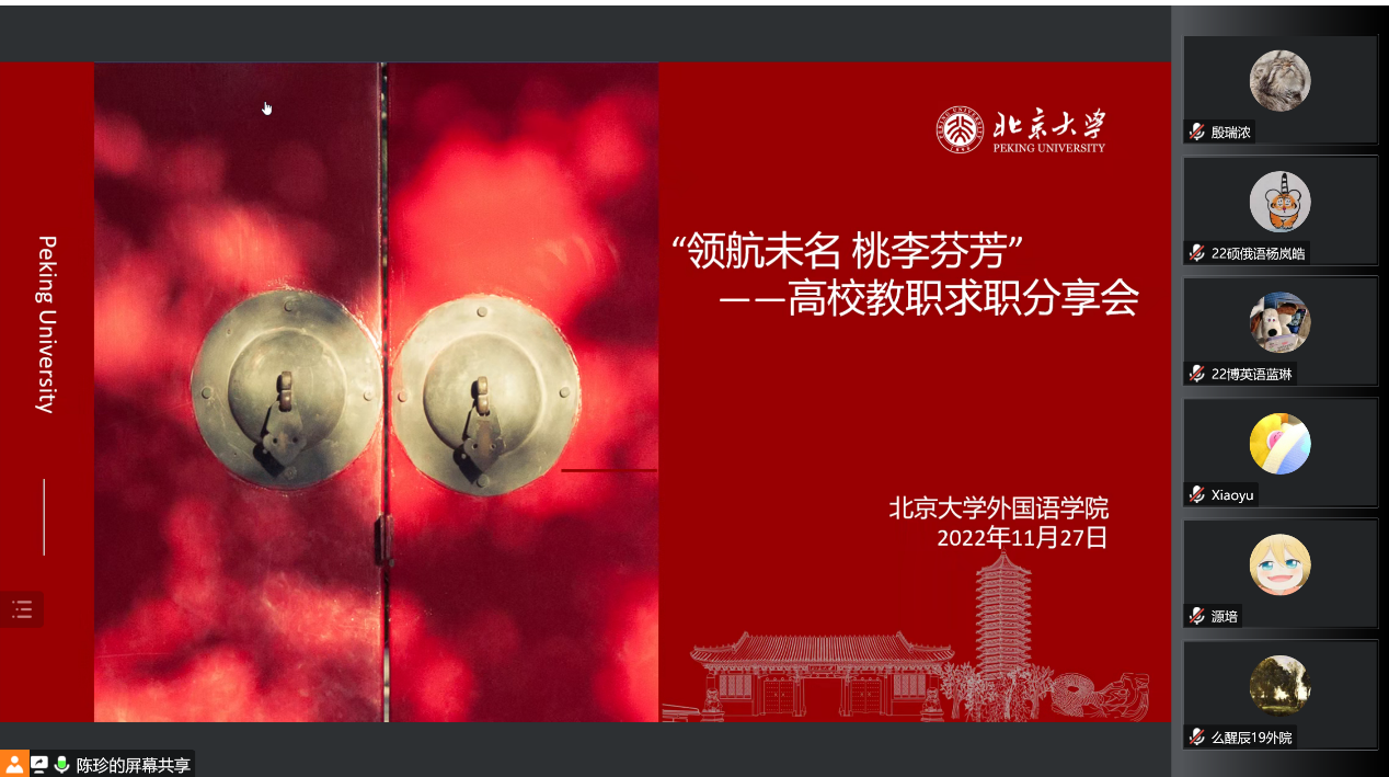 习近平总书记曾明确指出:“教师是教育工作的中坚力量。有高质量的教师,才会有高质量的教育。”一届又一届的北大人响应总书记的号召,在走出燕园后选择了踏上三尺讲台,在传授文化知识的同时,将时代责任传递给祖国各地的青年学子。为了帮助有志于教育事业的同学们进一步明确努力方向,2022年11月27日下午,华体会平台以线上形式举办了“领航未名 桃李芬芳”华体会平台高校教职求职分享会。华体会平台党委副书记王恒、团委书记伍昕钰、辅导员丁尧,以及学院五十余名学生参加了本次分享活动。