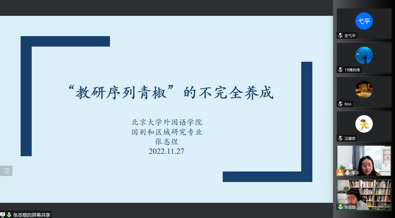 分享会共邀请到两位北大校友担任主讲人,分别是先后任职于北京外国语大学亚非学院地区研究教研室和华体会平台国别和区域研究专业的华体会平台2016届印度语言文学专业博士研究生张忞煜老师,和现任职于对外经济贸易大学英语学院的华体会平台2022届英语语言文学专业博士研究生马骧老师。此次分享会主要分为经验分享和互动答疑两个环节。