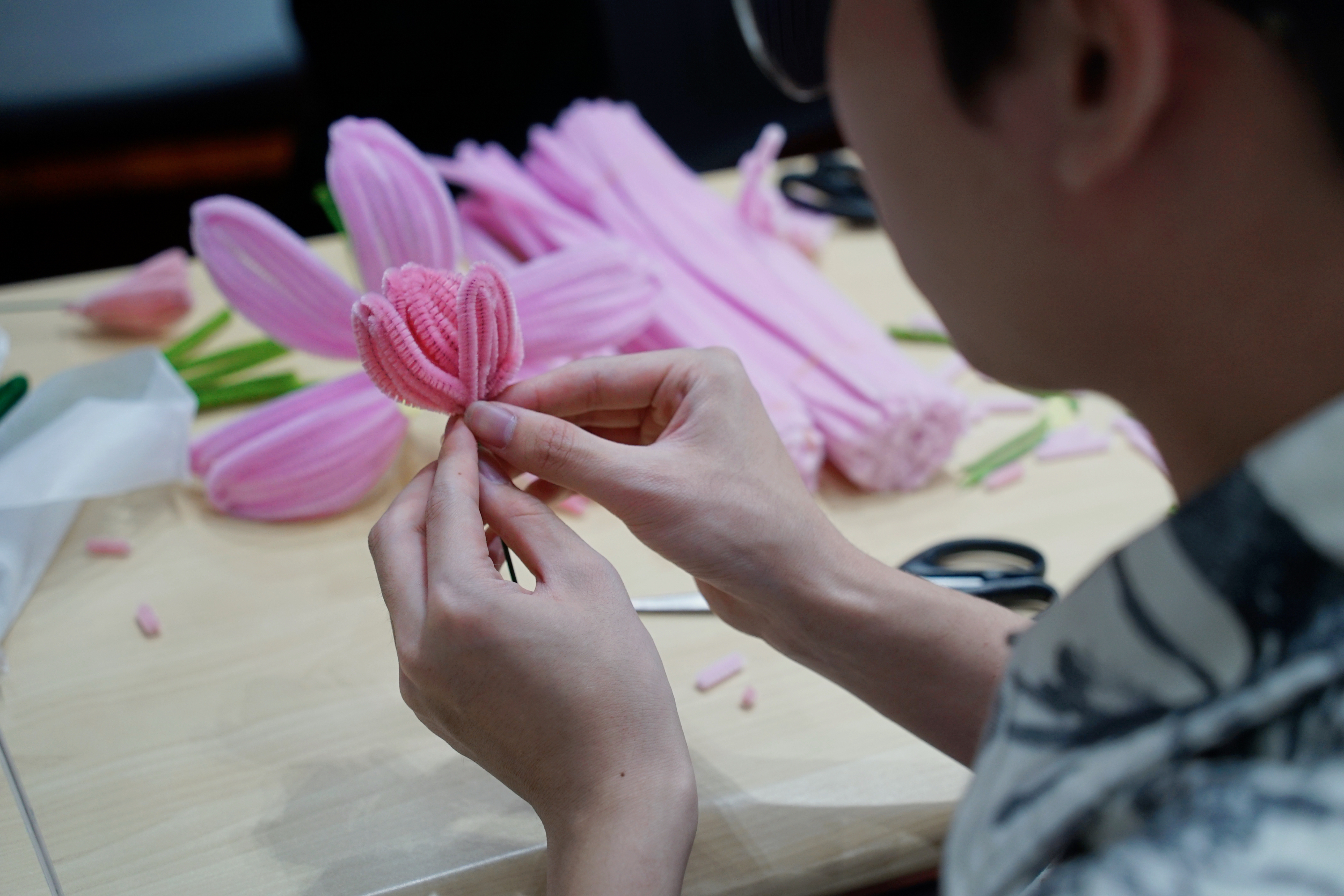 活动开始前,志愿者们在桌上摆放好手工花制作的各项材料,并贴心附上了制作教程。活动开始,在志愿者耐心的教导下,参与者们把一根根扭扭棒变成一朵朵在指尖绽放的鲜花。同学们在活动中有说有笑,有的同学心灵手巧,迅速完成了好几朵样式不同的花朵;有的同学在制作过程中好奇其他国家关于母亲节的文化;有的同学还讨论起自己所学专业的母亲节祝福的语法。