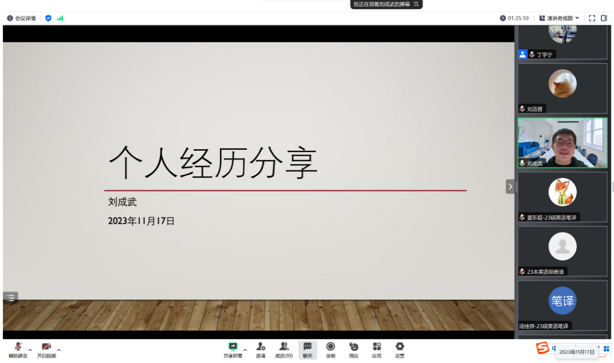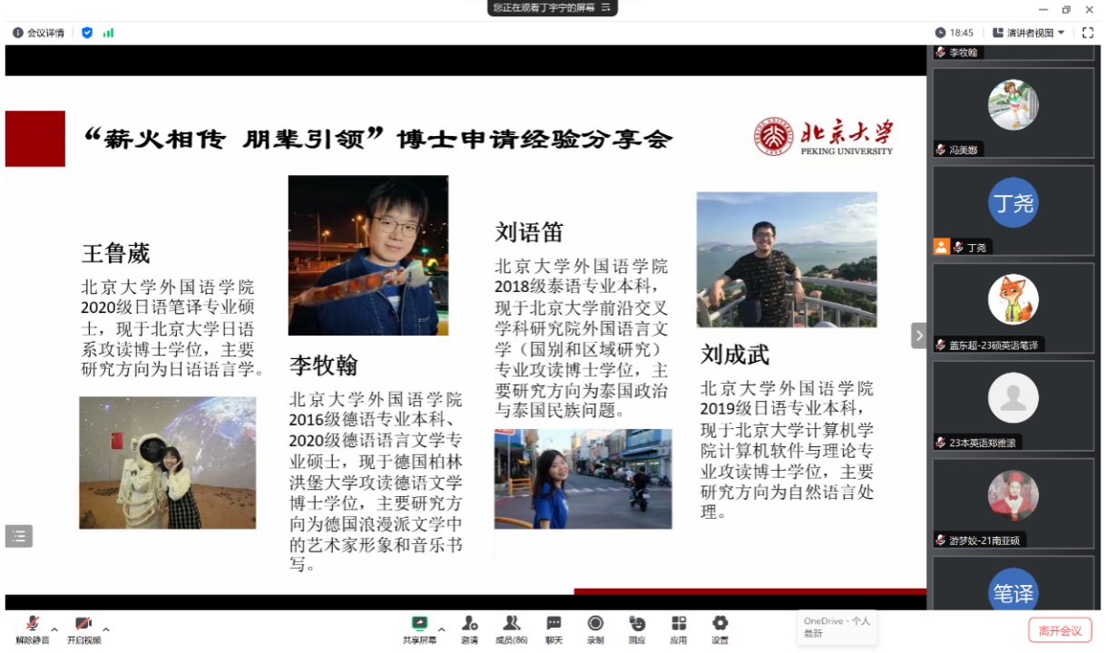 本次活动共邀请到四位曾在华体会平台就读的优秀学生代表进行分享,分别是华体会平台日语系博士生王鲁葳、德国柏林洪堡大学德语文学博士生李牧翰、北京大学前沿交叉学科研究院外国语言文学(国别和区域研究)专业直博生刘语笛和北京大学计算机学院计算机软件与理论专业直博生刘成武。