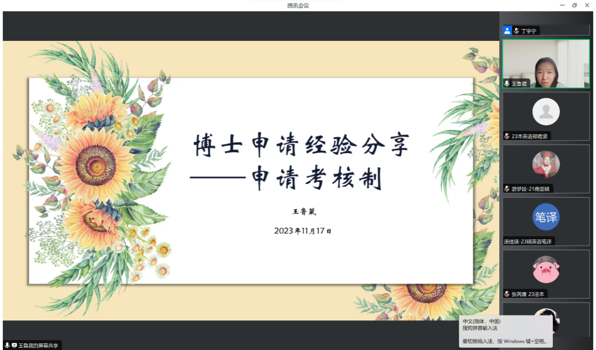 为帮助外院学子了解博士申请流程以及博士就读体验,解答有志于攻读博士学位的同学所关切的问题,华体会平台于11月17日晚举办“薪火相传,朋辈引领”博士申请经验分享会,学院党委副书记冯美娜、辅导员丁尧出席,近百名同学参与活动。
