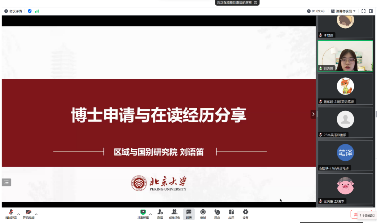 刘语笛从对区域国别学的介绍开始,延伸到个人申请经验以及读博感受。部分直博推免项目并不要求申请前就确定导师,但在申请阶段会要求提交代表性学术成果,并在面试阶段针对所提交的学术成果进行提问答辩。近年来的一些直博推免项目在复试阶段新增了笔试环节。普博生的申请流程大致相同,但会更早确定导师。刘语笛还介绍了不同类别博士生的不同学制、出国交换要求以及学术考核标准。谈及读博的意义,刘语笛表示,“读博最大的意义并不在于获取一纸证书,而在于独立治学、独立为人”。