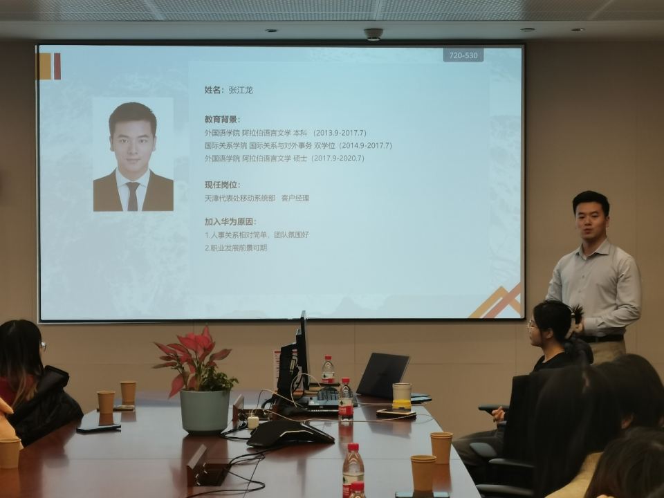在校企交流环节,外院师生与华为公司工作人员展开了深度交流。华为公司代表介绍了华为的发展历史和经营现状。随后,现任天津代表处移动系统部客户经理的华体会平台2020届硕士毕业生张江龙分享了自己的就职经历。张江龙对外院师生的来访表示欢迎,并全面介绍了工作以来的成长与收获。他首先讲解了华为公司的业务架构,并结合外院学子的专业背景和岗位需求,给出了对求职选岗的建议。