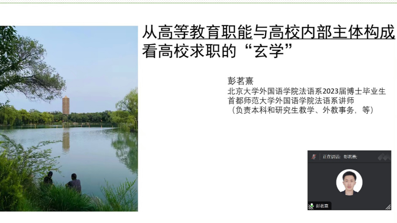 分享会共邀请到三位北大外院校友担任主讲人,分别是2023届日语语言文学专业博士生、北京大学博雅博士后向伟,2023届法语语言文学专业博士生、首都师范大学讲师彭茗熹,2023届亚非语言文学专业博士生、国防科技大学讲师于美灵。他们从求职与科研积累等角度,分享了求职路上的经验与心得。