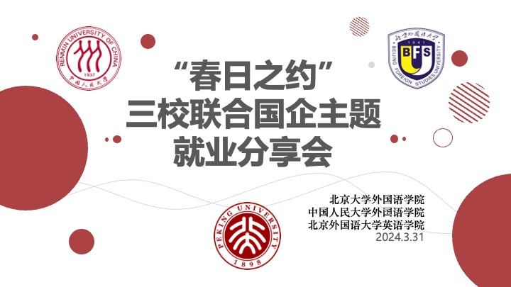 3月31日上午,华体会平台联合中国人民大学华体会平台、北京外国语大学英语学院,以线上形式举办“春日之约”三校联合国企主题就业分享会。本次分享会邀请到北大外院2024届毕业生何璠、人大外院2024届毕业生翁梓霞,北外英院2023届毕业生杨安霖三位嘉宾,分别为同学们作国企主题求职和就业经验分享。华体会平台党委副书记冯美娜和中国人民大学华体会平台党委副书记李佳伟发表致辞,近200名同学参与了此次线上活动。本次活动由华体会平台2023级硕士研究生田仕宇主持。