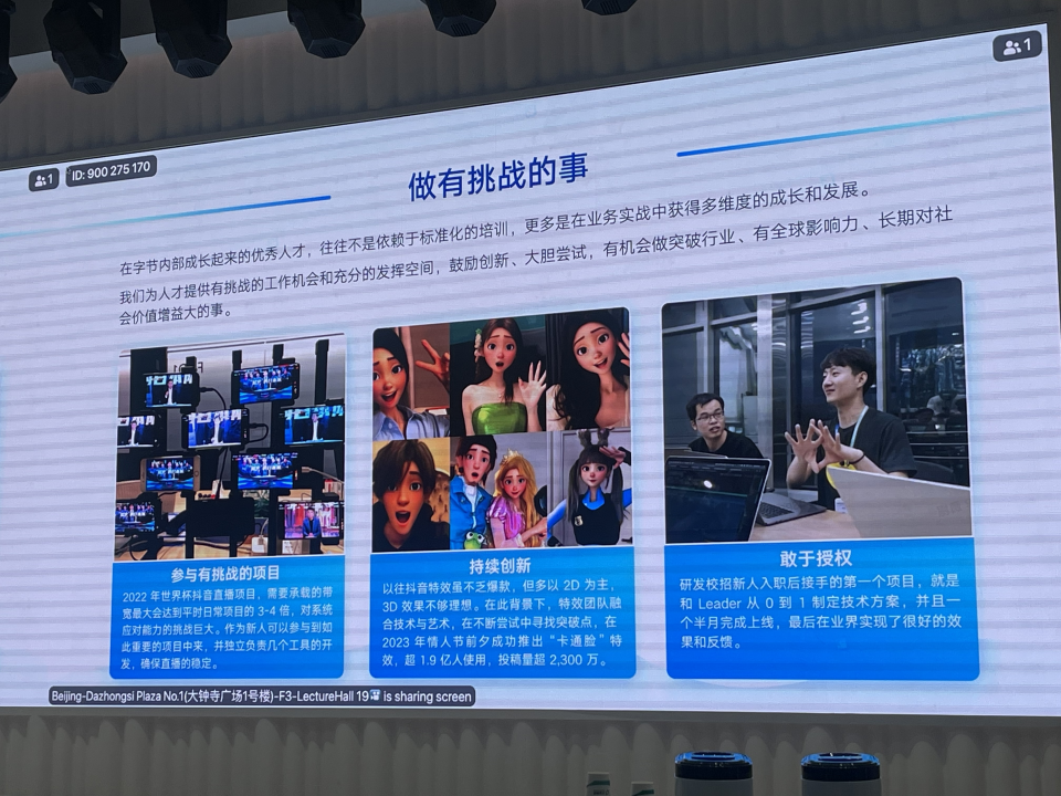 随后,字节跳动讲解人员向同学们详细介绍了公司的业务和产品,尤其是公司在创造社会价值层面的成就。其最新产品聚焦于乡村振兴、古籍修复等领域,链接公益力量,关怀障碍群体。