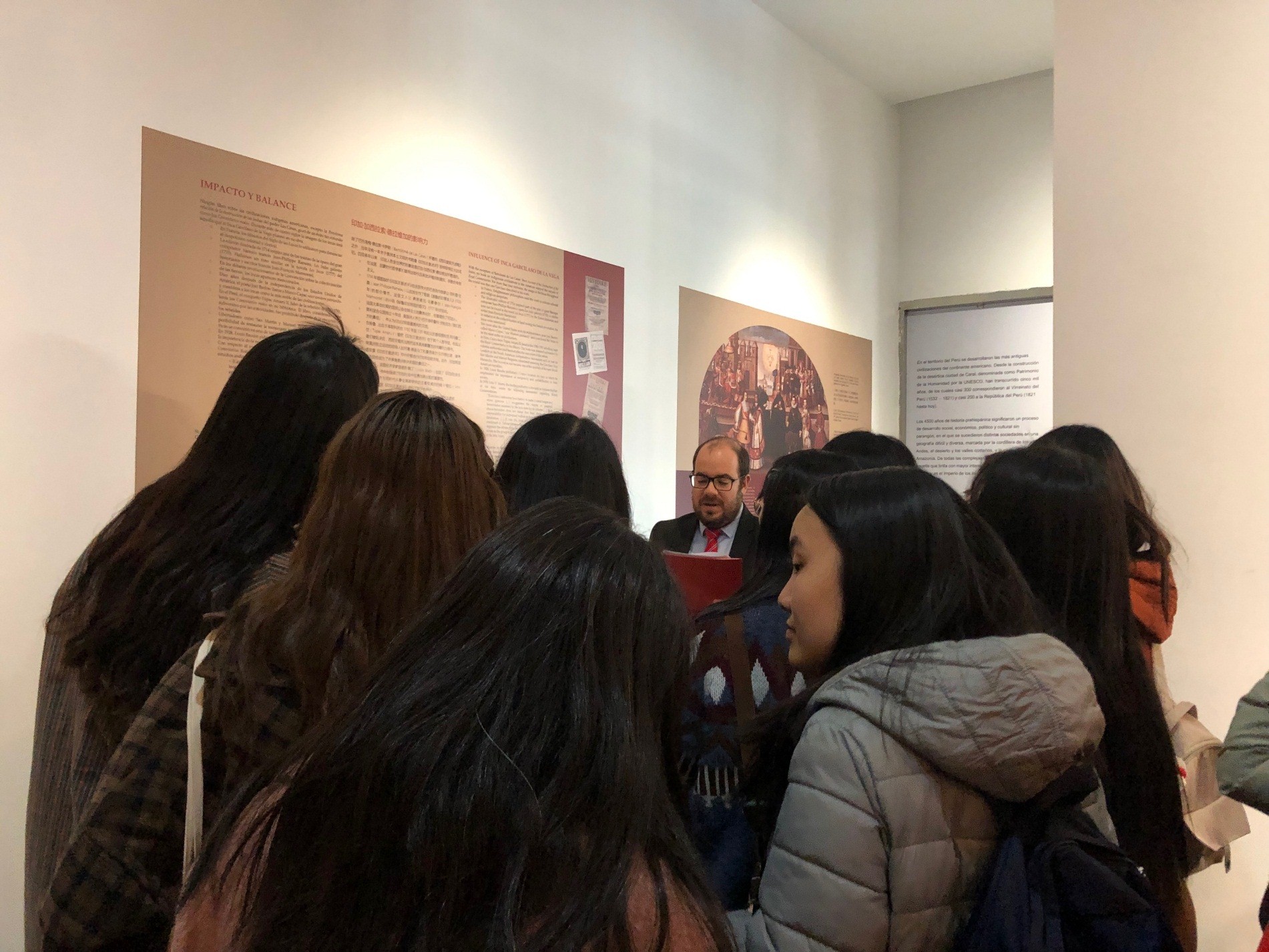 下午二时许,全体参访学生在塞万提斯学院集合。在秘鲁大使馆文化处官员伊格纳西奥·巴尔加斯(Ignacio Vargas)的带领下,西语专业学生参观了塞万提斯学院与秘鲁大使馆联合举办的《印卡·加西拉索·德拉维加与美洲「梅斯蒂索」文化的诞生》展览。
