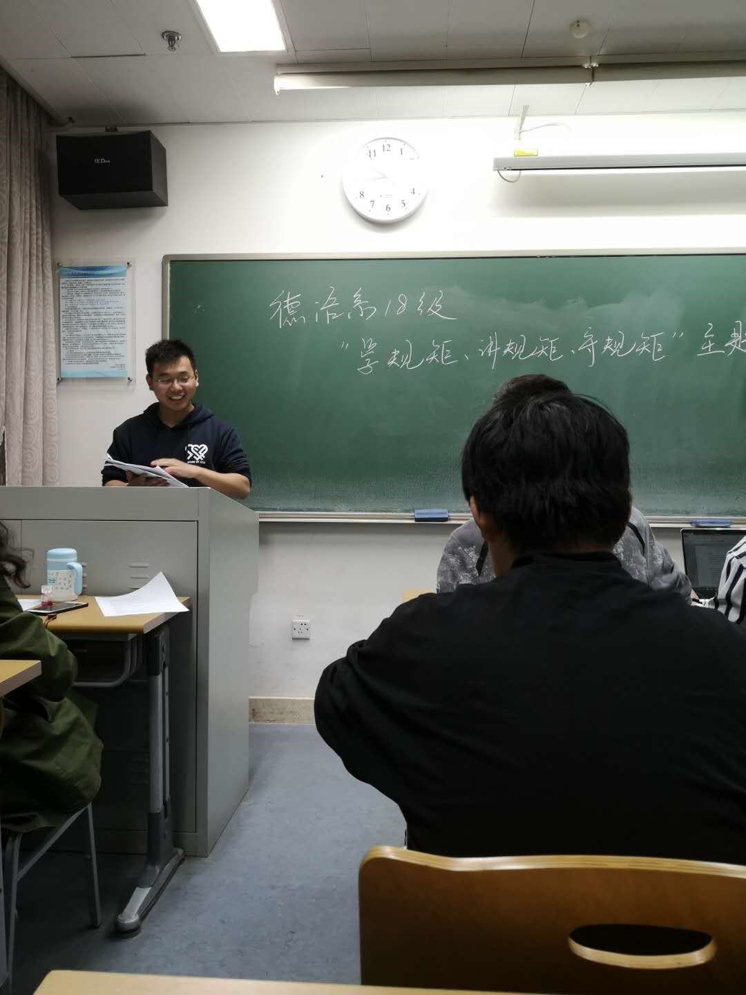 2019年4月20日20:40,华体会平台2018级德语专业本科生班在四教505举办“学规矩、讲规矩、守规矩”主题活动,2018级德语专业所有本科生均参加了班会,学习活动由班长马子函主持,辅导员李涛为同学们宣讲校规校纪。