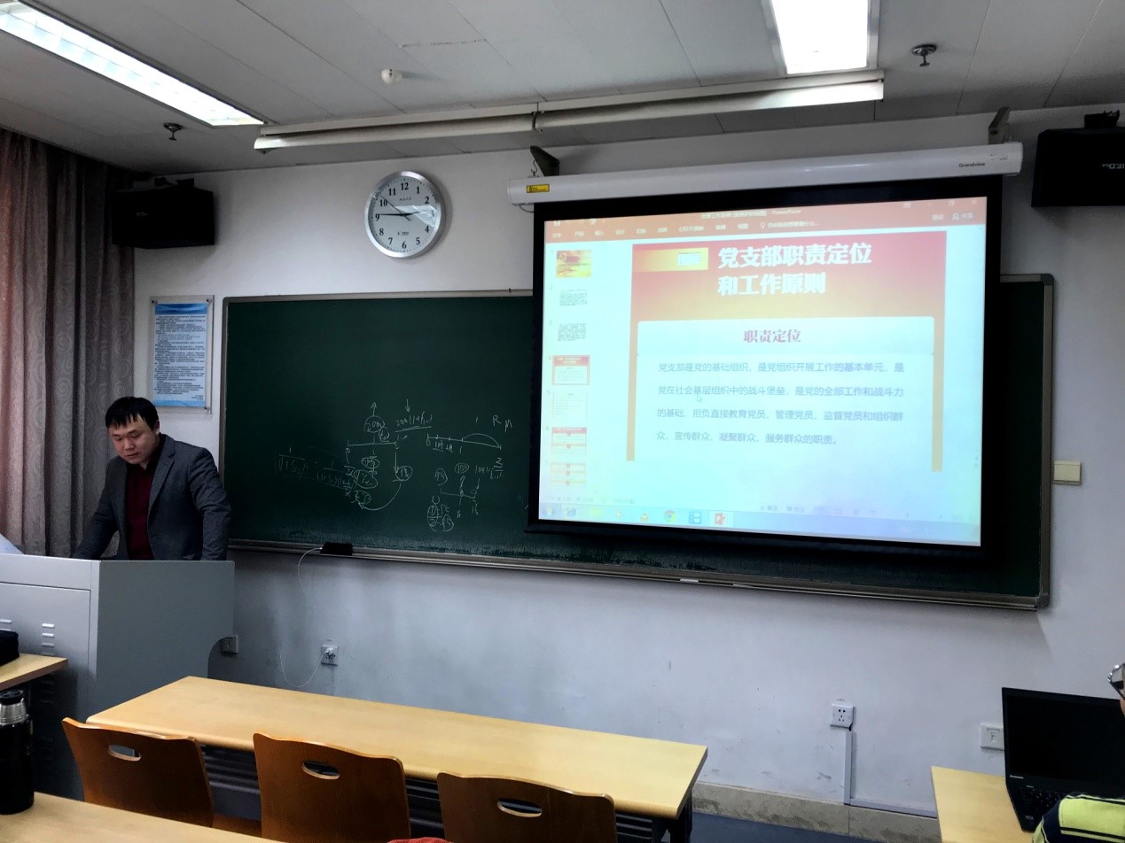 吴宇轩同志在会上传递了院党委此次党支部改组的精神:依照《中国共产党章程》和《中国共产党支部工作条例(试行)》,严格规范组织生活。要求增加活动频次,增强活动质量,提高全体党员参与程度。此次改组依照二级学科建立支部,依照三级学科或专业方向建立党小组,充分发挥支部建在专业上的优势,支部活动与专业活动相结合,促进活动多样多元化,体现学院、专业特色。依照党章和支部工作条例,支部将认真贯彻“三会一课”制度,每月相对固定一天开展主题党日活动,各党小组结合专业实际,开展形式多样、内容丰富的小组活动。希望全体党员积极发挥才智和创造力,为支部的发展建言献策,促进支部的不断发展壮大。