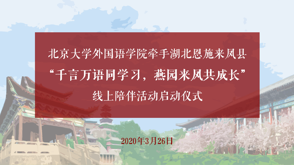 3月15日,习近平总书记给北大援鄂医疗队全体“90后”党员回信,勉励广大青年在为人民服务中茁壮成长,在艰苦奋斗中砥砺意志品质,在实践中增长工作本领,不惧风雨,勇挑重担,让青春在党和人民最需要的地方绽放绚丽之花。战“疫”期间,北大外院带领各党团支部和全体外院青年,发挥专业优势,投身志愿服务。此次活动中,外院同学将与来凤县中小学生进行“同学习、共成长”的线上陪伴活动,共同增强抗疫信心,践行外院人“世界在我脚下,祖国在我心中”的理念。