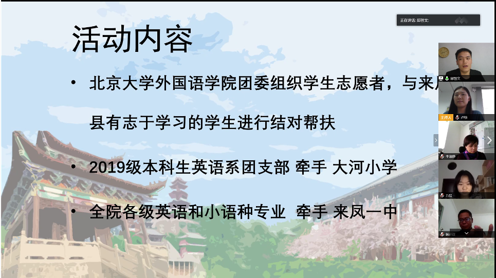 王恒分享了外院的基本情况和防疫工作概况。通过播放外院20周年院庆视频,王恒介绍了北大外院的发展历程和基本情况。此次疫情中,外院各党团支部共开展近200次党团日活动,集体学习习近平总书记的两次回信精神,并开展了专题讲座、“同桌计划”、线上K歌大赛等文体活动,陪伴同学们的居家生活;外院学子还积极投身防疫的志愿服务,通过借助专业翻译防疫物资、无偿献血等方式为抗击疫情做贡献。王恒希望外院同学和来凤同学同心协力、攻克时艰,互相陪伴,一起成长。