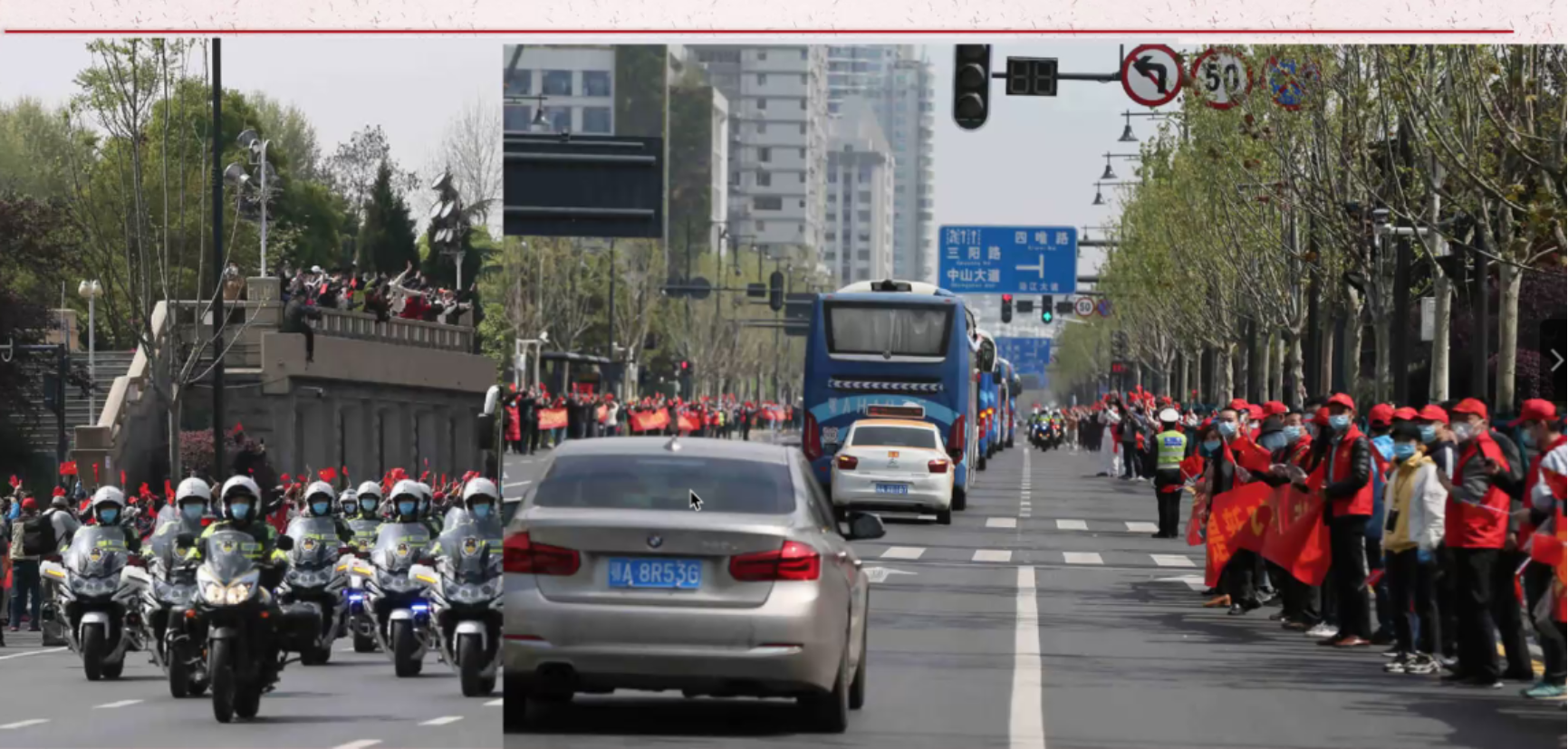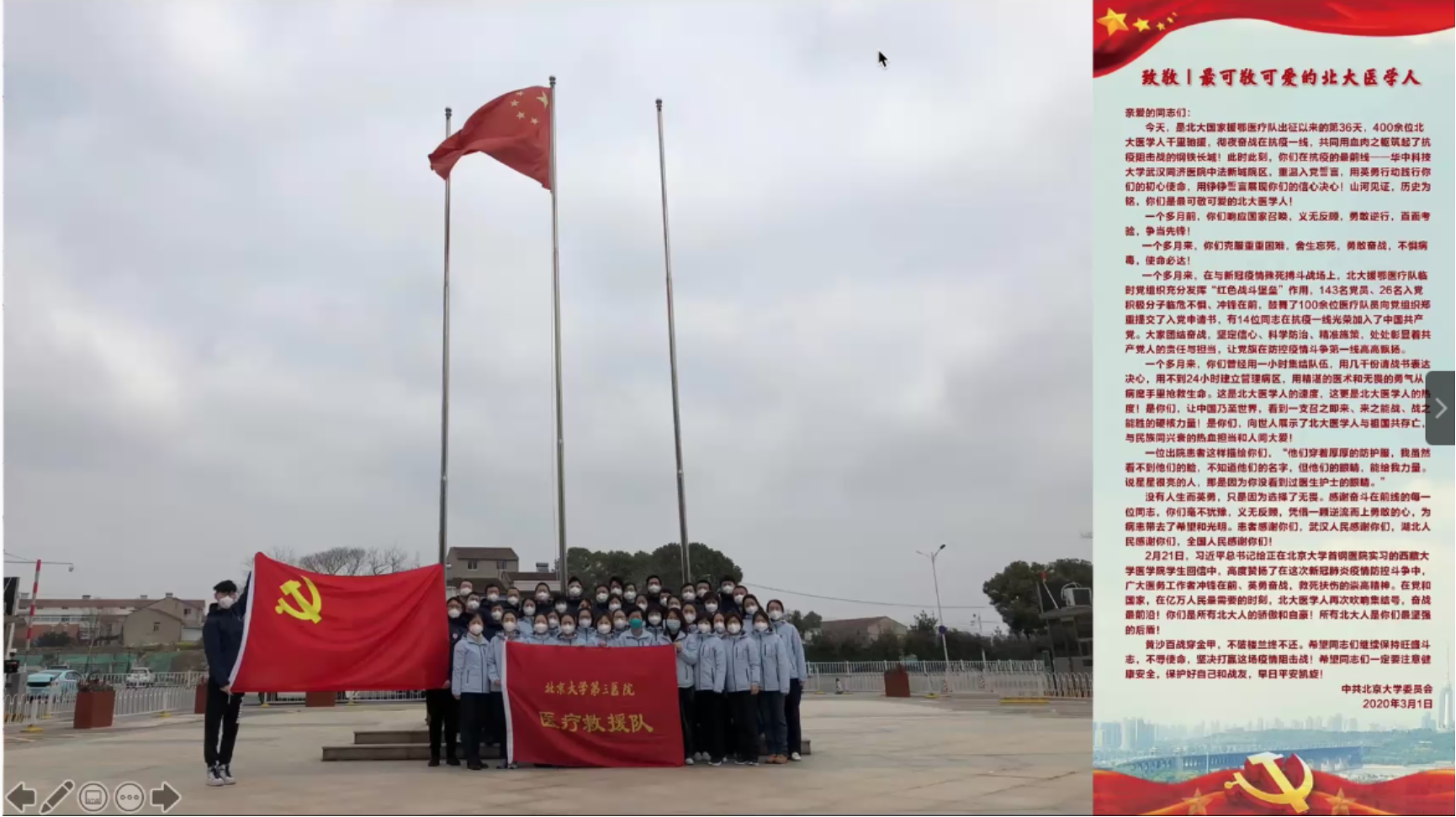 最后,他回顾了医疗队离开武汉时,骑警为大巴车开道,人民透过窗户伸出国旗、自发送行的场景,并展示了长江二桥上“武汉加油”字样的照片。在讲述的最后,他祝愿国家山河无恙、早日渡过这次难关,希望毕业生们在成长路上不断磨炼本领、积极报效国家,将精诚爱国之心化作昂扬的精神风貌。