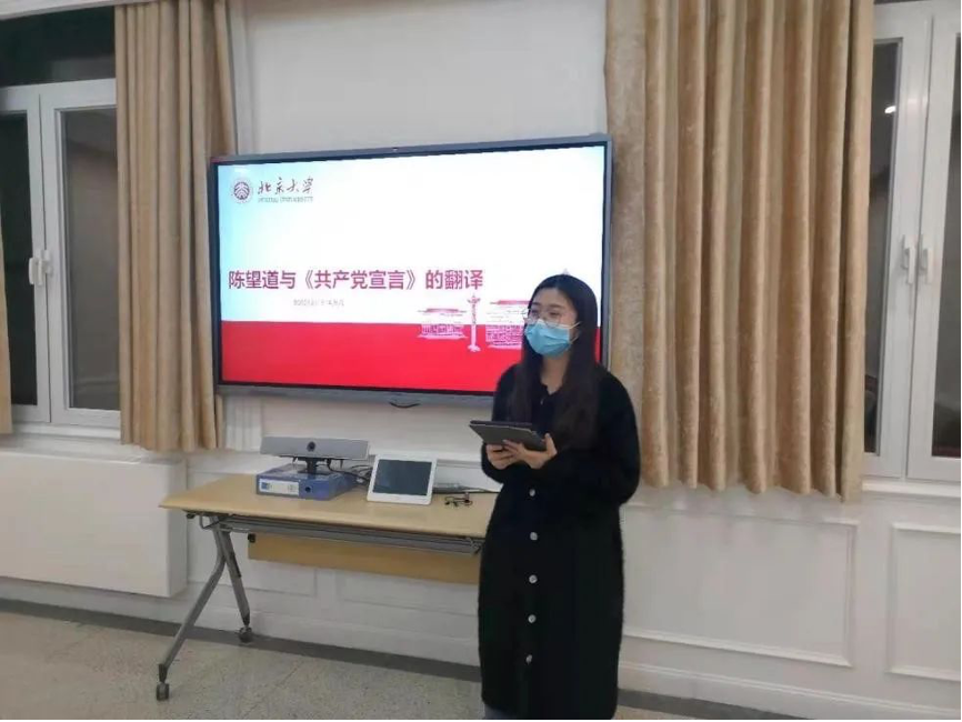 4月8日晚,华体会平台团委第二场“骨干讲党史”党史学习教育在外文楼206室举行。团委学生副书记、2018级英语系许源睿同学以陈望道与《共产党宣言》的翻译为切口,结合自己在参加实践活动时参观陈望道故居的经历,给大家上了一堂精彩的党课。院团委书记卢敏、副书记于丹与团委各部门骨干共同学习。