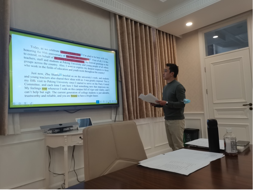 英语班读书会的领读人周孟带领学生们学习了《青年要自觉践行社会主义核心价值观》。他简要介绍了此篇讲话的背景,并深入浅出地分析了社会主义核心价值观与青年群体的关系。随后,他联系五四青年节,与学生们具体探讨了五四运动与五四精神。读书会结束的时候,他带领学生们观看了电视剧《觉醒年代》中的片段,学习了辜鸿铭的演讲《中国人的精神》。