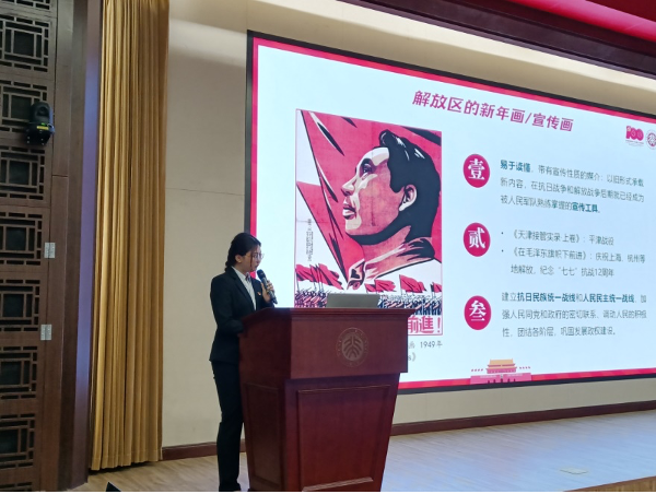 本科生第二党支部从新中国成立初期解放区的新年画、宣传画入手,介绍了文艺宣传对鼓励全国人民投身新中国建设的积极作用,再现了团结一心、热火朝天的建设场景,阐明了中国共产党强大的动员力与凝聚力。