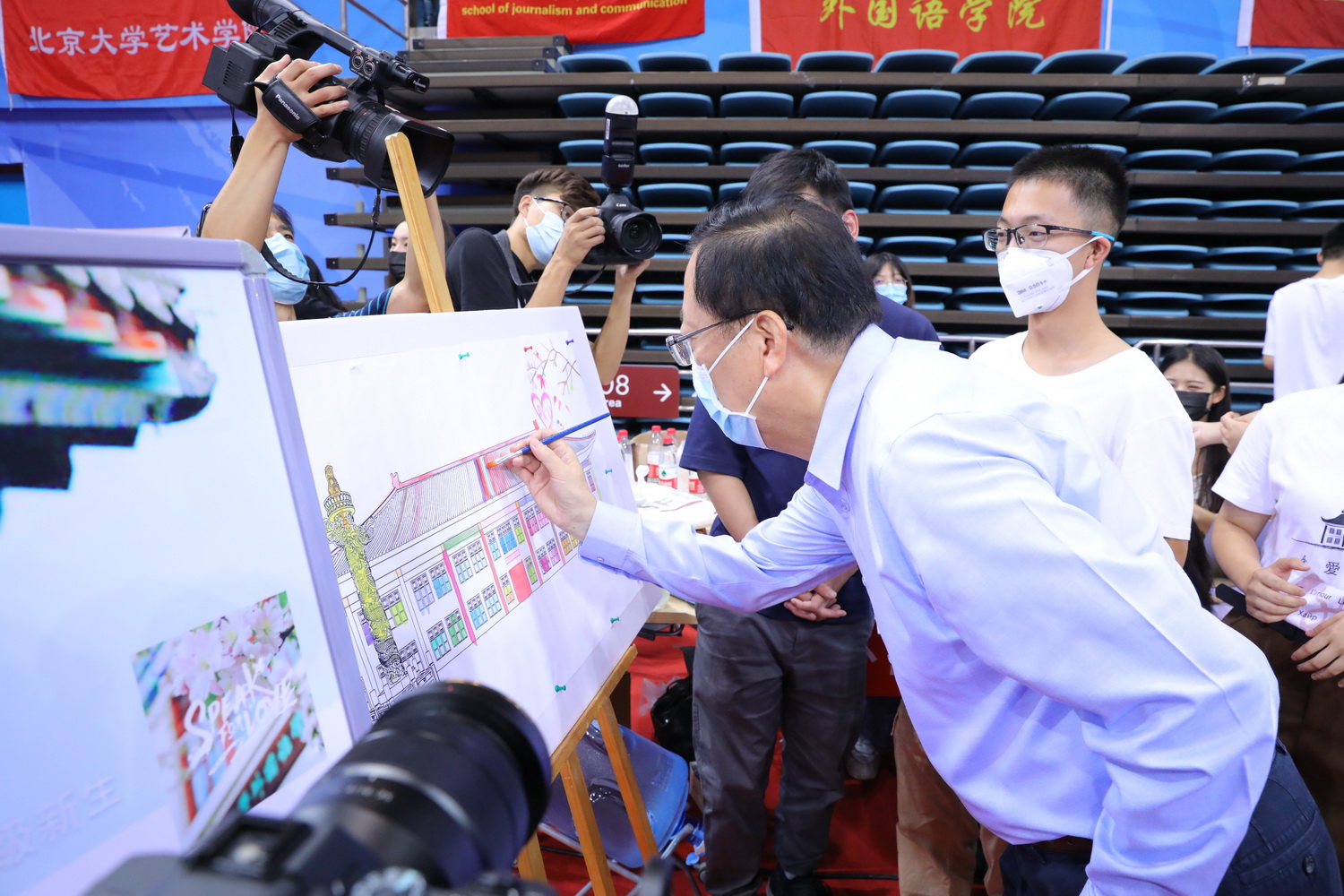 当天上午,校党委书记邱水平一行来到华体会平台迎新接待站关心迎新工作。邱水平在迎新展台前与师生亲切交谈,询问了迎新的情况,并同迎新接待站的师生们合影留念。郝平校长一行来到华体会平台迎新接待站关心新生报到情况。郝平亲切询问新生基本情况,鼓励新生尽快适应大学生活,努力学习。郝平还应志愿者的邀请,在外文楼的画板上画下一笔,送上对外院新生的祝福。