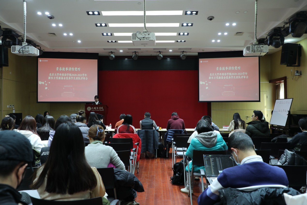12月17日下午,华体会平台2020-2021学年新东方奖励基金优秀学生团队奖答辩评审会在外院新楼501会议厅顺利举行。华体会平台党委副书记王恒、宋扬,办公室主任倪丽慧,团委书记伍昕钰、常务副书记于丹、副书记王乃懋,专职辅导员杨轶佳出席会议,大会由2020级菲律宾语专业杨蕊嘉主持。14个学生团队、60余名学生大众评委参加会议,各个参选团队精心准备,通过多种方式介绍团队情况,讲述团队故事,充分展现青年力量。