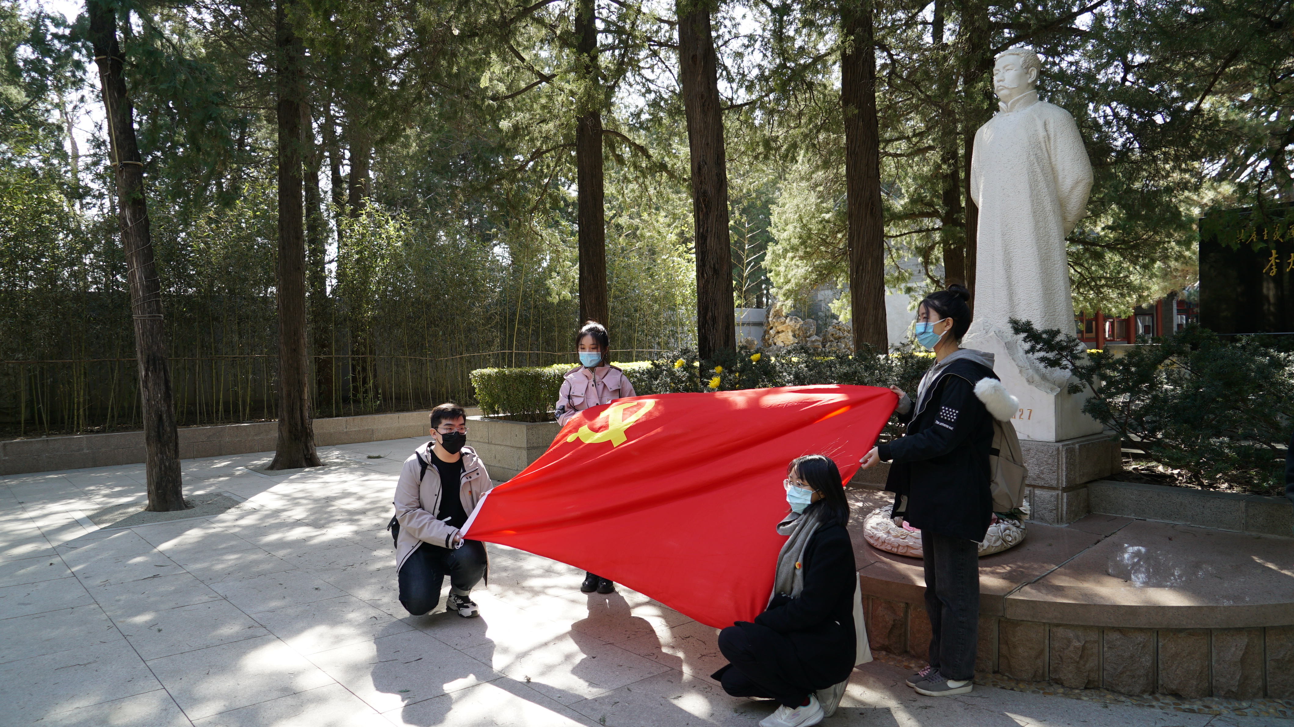 祭扫环节中,学员们在庄严肃穆的氛围中,于汉白玉打造的李大钊同志雕像前展开党旗,驻足默哀,敬献鲜花,瞻仰陵墓。阵阵狂风中,学员们仿佛置身于曾经那个风云激荡的时代,深切体会山河破碎之时李大钊先生勇担民族复兴之使命担当,为党、国家和人民而奉献一切的不凡气魄。作为优秀学员代表,学员黄杰舜和李达镐分别结合自己在课外阅读及参观学习中的心得体会与大家分享感想,进一步引发了大家对李大钊烈士敢为人先、不怕牺牲的革命精神的共鸣与思考。
