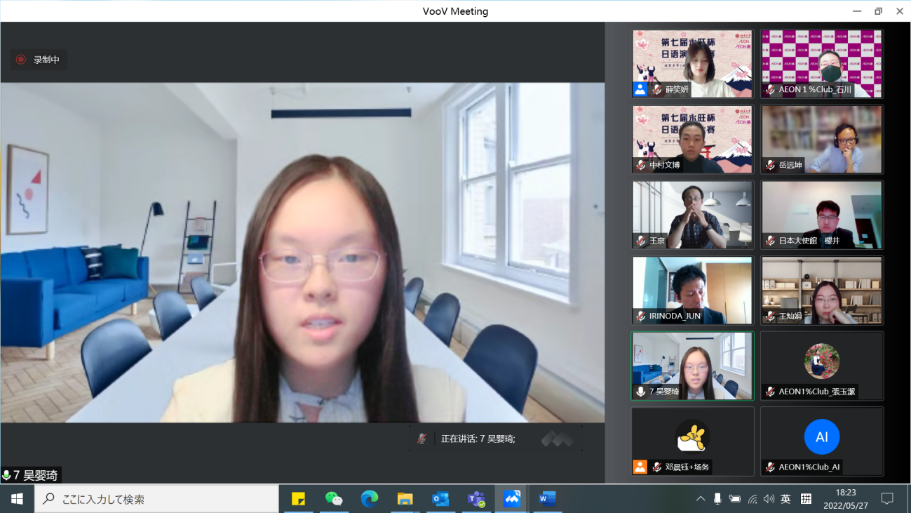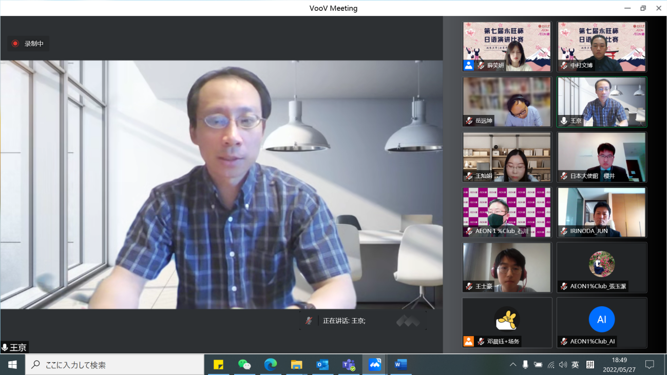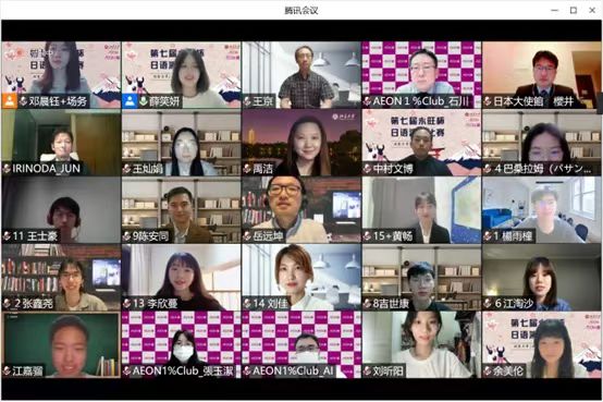 本届“永旺杯”采用线上会议的比赛模式,邀请校内外的日语专家们出席并担任嘉宾及评委。日本国驻华大使馆公关文化中心二等秘书樱井真一、公益财团法人永旺1%俱乐部事务局次长石川忠彦、永旺商业有限公司总经理入野田润、北京大学教育基金会项目管理部部长禹洁、华体会平台日本语言文化系副教授王京、助理教授岳远坤、王灿娟出席本次比赛。