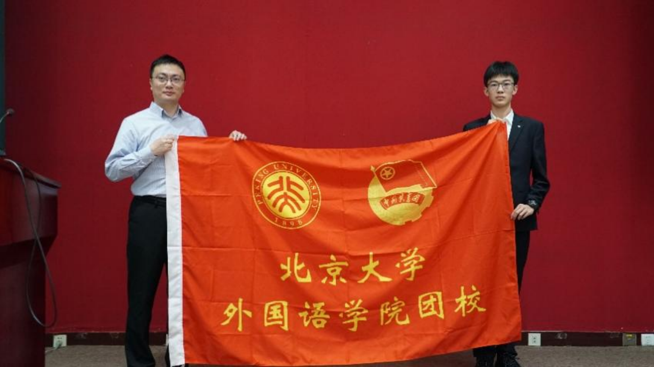 在团校全体学员的见证下,鞠晓为新一届团校授旗,新生代表王建坤接过旗帜,象征着将接力棒交到了新学年团校学员的手中。
